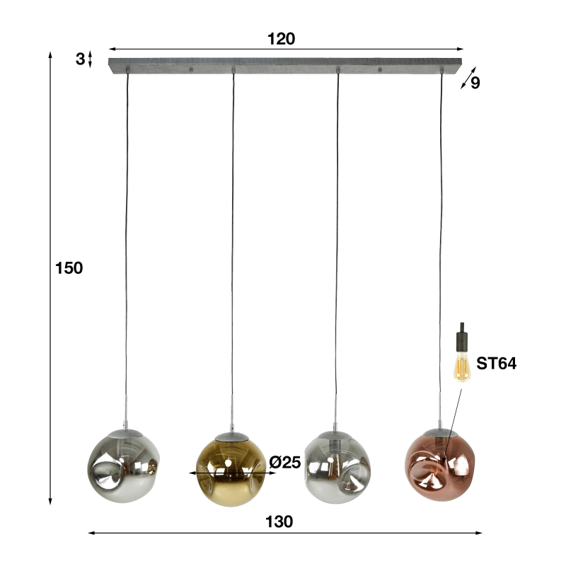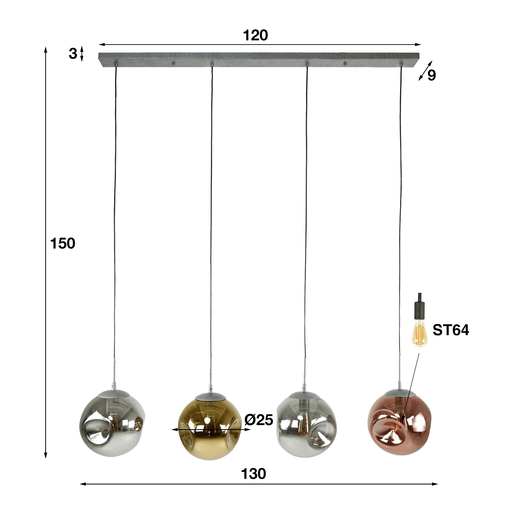 Avec la suspension style industriel en métal avec abat-jours en verre Caleo, nous avons imaginé un luminaire qui joue avec la lumière comme d’autres jouent avec la matière. Nos designers souhaitaient créer une pièce capable d’éclairer une table ou un espace de vie tout en évoquant la poésie des astres : quatre sphères de verre soufflé, chacune dotée de reflets métallisés, suspendues en apesanteur le long d’une ligne sobre en métal.