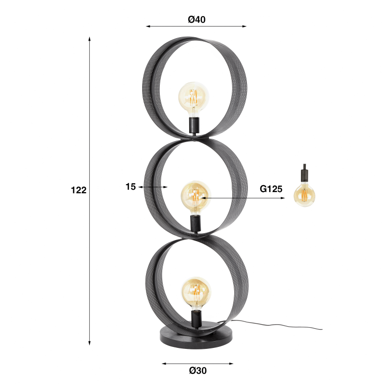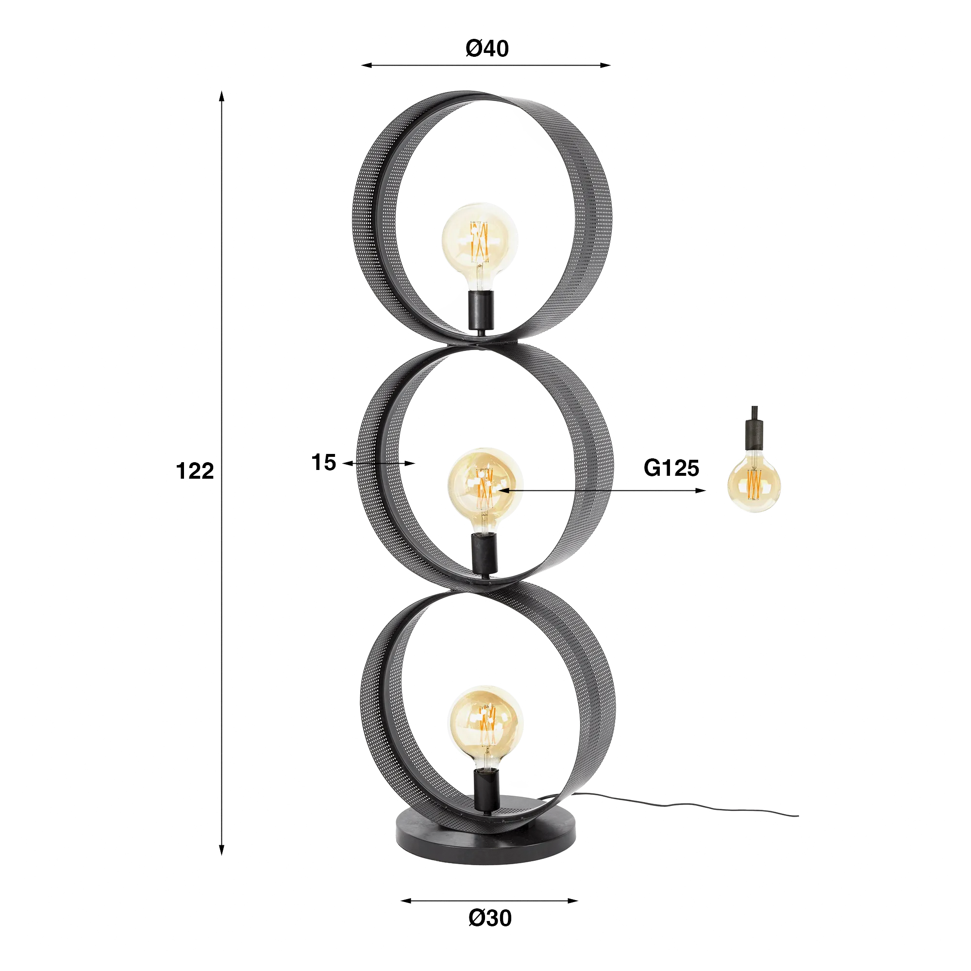 Réalisée en métal, la structure de cette lampe de salon en métal avec finition anthracite révèle une texture percée qui laisse filtrer la lumière avec douceur. Nous avons travaillé le dessin de ces anneaux pour qu’ils conservent une vraie présence visuelle sans jamais alourdir l’espace. Haute d’environ 122 cm, la lampe s’élève avec légèreté, portée par une base ronde de 30 cm de diamètre qui lui assure stabilité et ancrage.