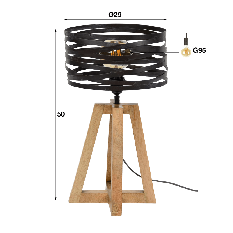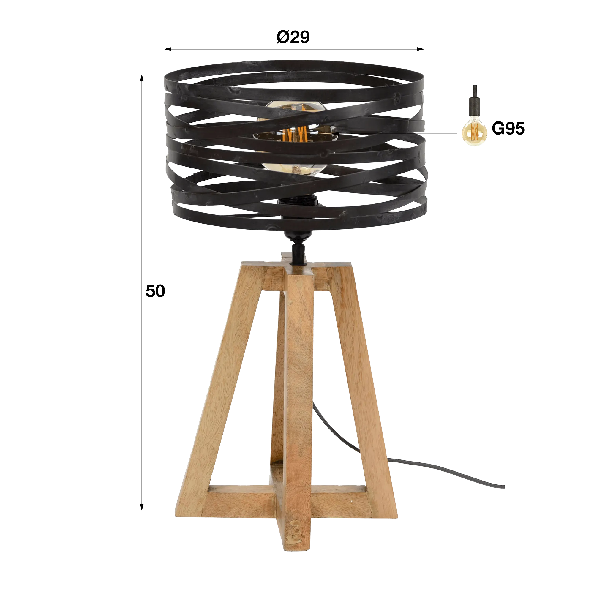 Le pied en bois de cette lampe de bureau style industriel en bois avec abat jour en métal torsadé, travaillé avec une structure ouverte et stable, apporte une sensation d’ancrage naturel. Sa hauteur de 50 cm crée une présence douce, idéale sur un buffet, une console ou une table d’appoint. Le métal qui compose l’abat-jour, d’un diamètre de 29 cm, diffuse une lumière texturée, créant sur les murs un jeu d’ombres délicat et vivant. À la tombée du jour, l’ensemble déploie une ambiance chaleureuse, presque enveloppante, accentuée avec une ampoule recommandée de type G95 (non incluse), pour une harmonie parfaite avec la structure.