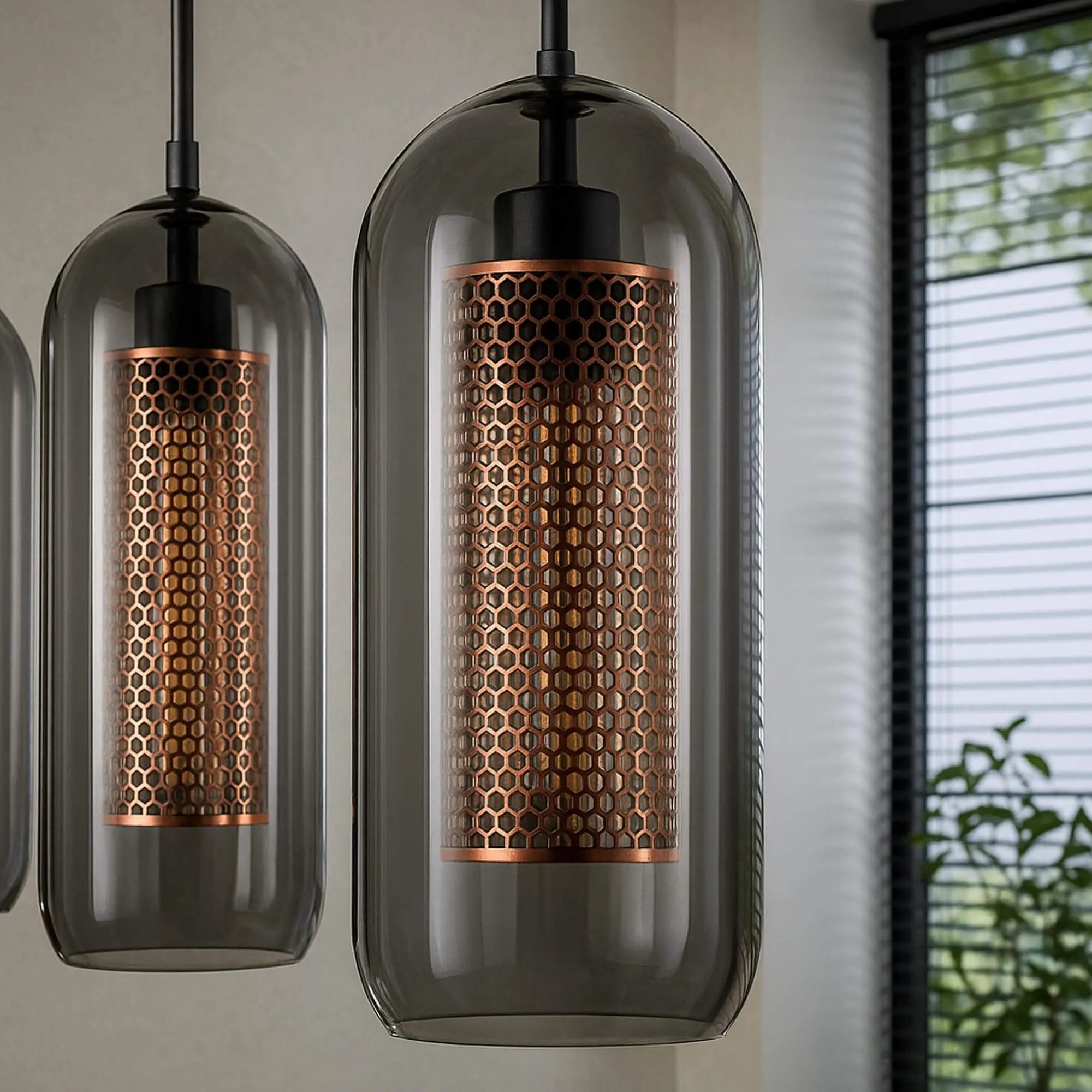 Pour imaginer la lampe suspendue avec abat-jours en verre fumé soufflé Brila, nous avons souhaité créer une suspension qui accompagne les moments du quotidien tout en révélant la beauté simple des matières. Les quatre abat-jours en verre fumé soufflé, chacun d’un diamètre de 15 cm, apportent une présence douce et enveloppante au-dessus d’une table ou dans un espace de vie. Leur transparence subtile laisse apparaître une grille métallique cuivrée que nous avons travaillée avec une trame hexagonale, choisie pour la délicatesse de son relief et la manière dont elle filtre la lumière.