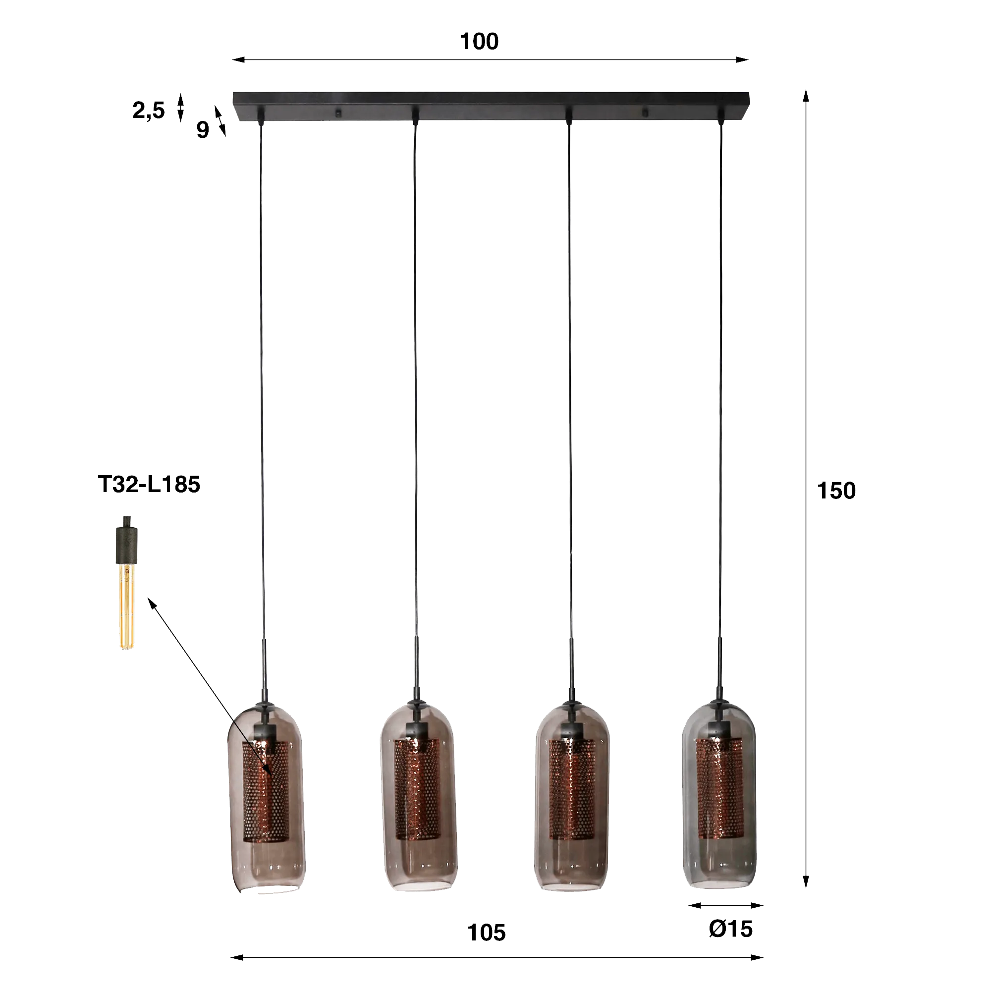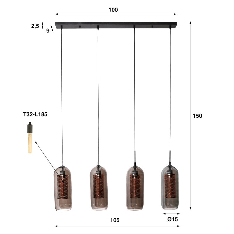 Le métal noir et la teinte chaude du cuivre se complètent naturellement, créant un contraste raffiné que nous aimons particulièrement. L’abat-jour en verre soufflé, légèrement arrondi à sa base, diffuse une lumière harmonieuse, idéale pour accompagner un repas ou éclairer une grande pièce avec chaleur. L’installation de cette lampe suspendue avec abat-jours en verre fumé soufflé, simple et intuitive, permet de profiter rapidement de la suspension. Les ampoules T32-L185 (non incluses), permettent d’ajuster la tonalité lumineuse selon l’ambiance recherchée.