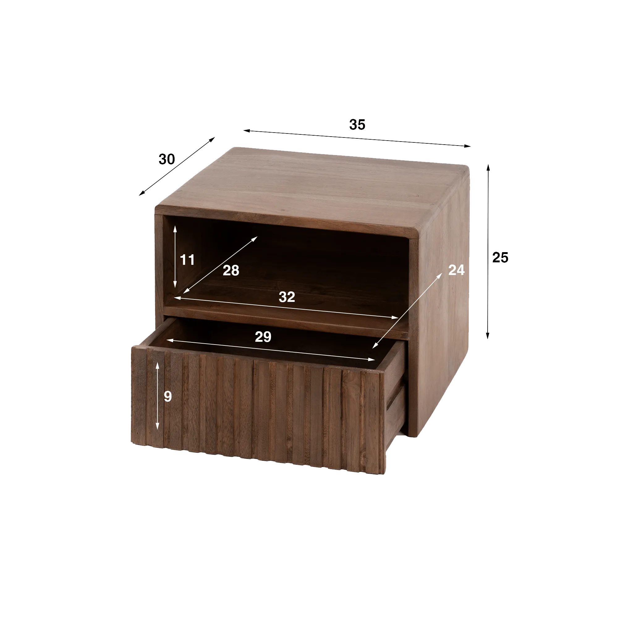 Réalisée en acacia massif, chaque pièce de cette table de chevet suspendue en bois naturel révèle un bois dense, vivant, aux nuances chaleureuses et aux veinages expressifs. Le toucher est doux, légèrement satiné, et la finition met en valeur la matière sans la figer. Nous avons accordé une attention particulière au travail de la façade rainurée du tiroir, dont le relief capte subtilement la lumière et donne du rythme à l’ensemble, tout en conservant une lecture très épurée du volume.