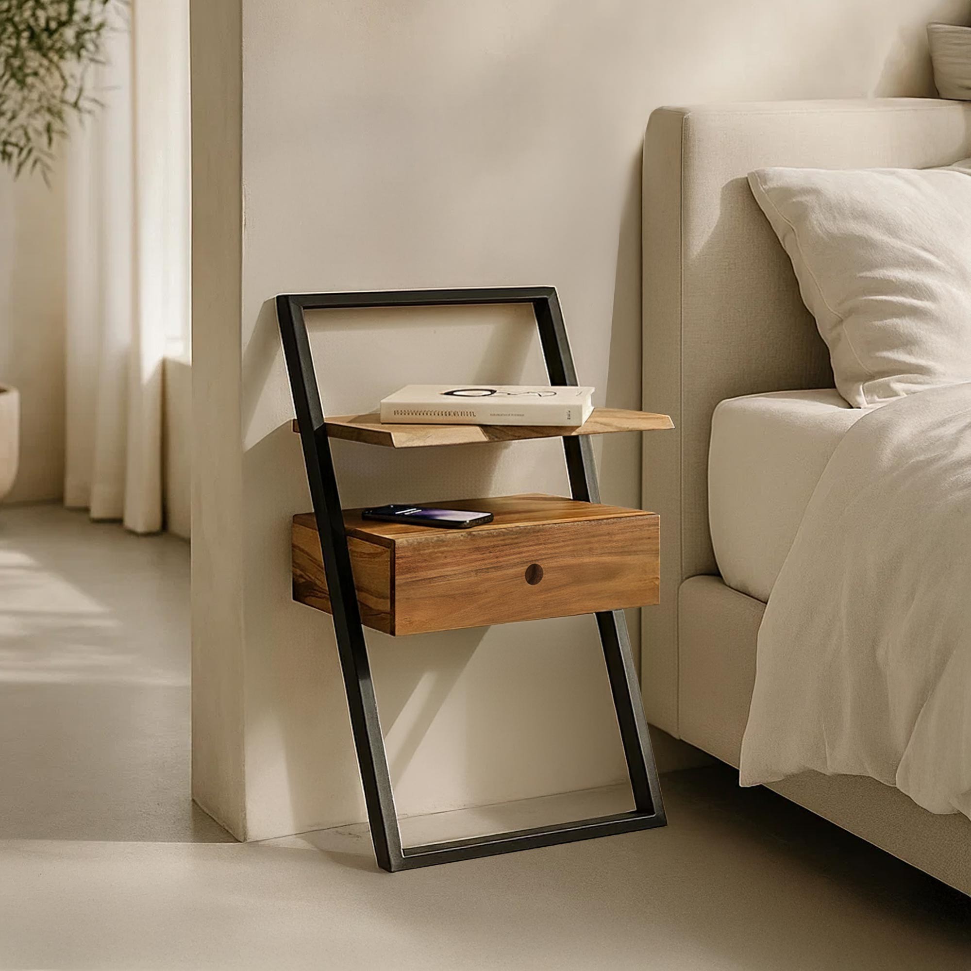 Pensée comme une pièce d’équilibre entre rigueur industrielle et chaleur naturelle, la table de chevet en bois massif d'acacia Lean incarne notre manière d’aborder le mobilier du quotidien : fonctionnel, sincère et porteur de caractère. Dès les premières esquisses, nos designers ont cherché à créer une présence légère mais affirmée, capable de structurer l’espace sans jamais l’alourdir.
