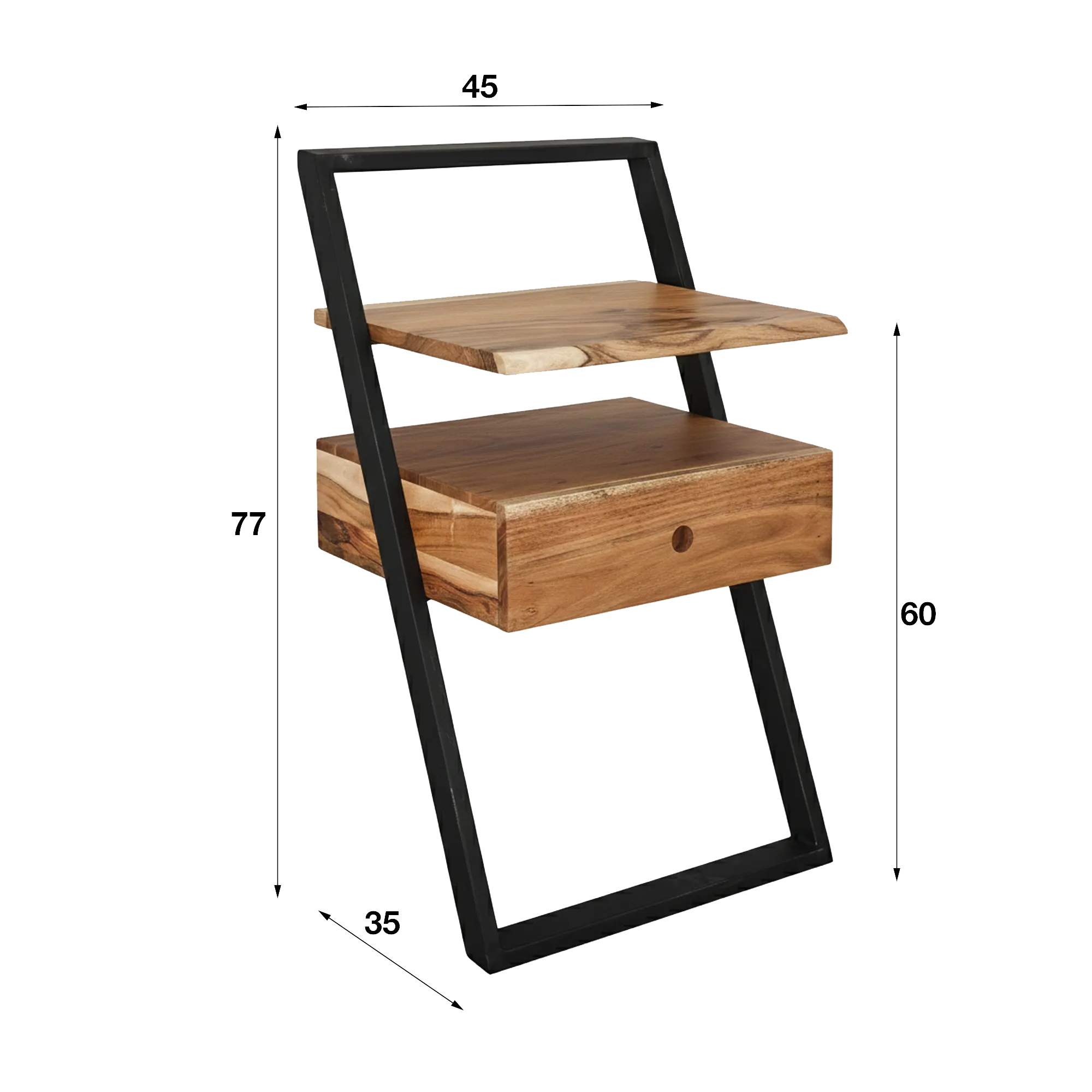 La structure graphique de notre table de chevet en bois massif d'acacia Lean, inspirée du style industriel avec ses contours en métal noir, apporte une stabilité rassurante tout en laissant respirer l’ensemble. Avec une largeur d’environ 45 cm et une profondeur proche de 35 cm, la table de chevet Lean trouve facilement sa place à côté du lit, même dans des chambres plus compactes. Sa hauteur totale d’environ 77 cm permet une utilisation confortable, tandis que le plateau supérieur, situé autour de 60 cm du sol, accueille naturellement une lampe, un livre ou un téléphone.