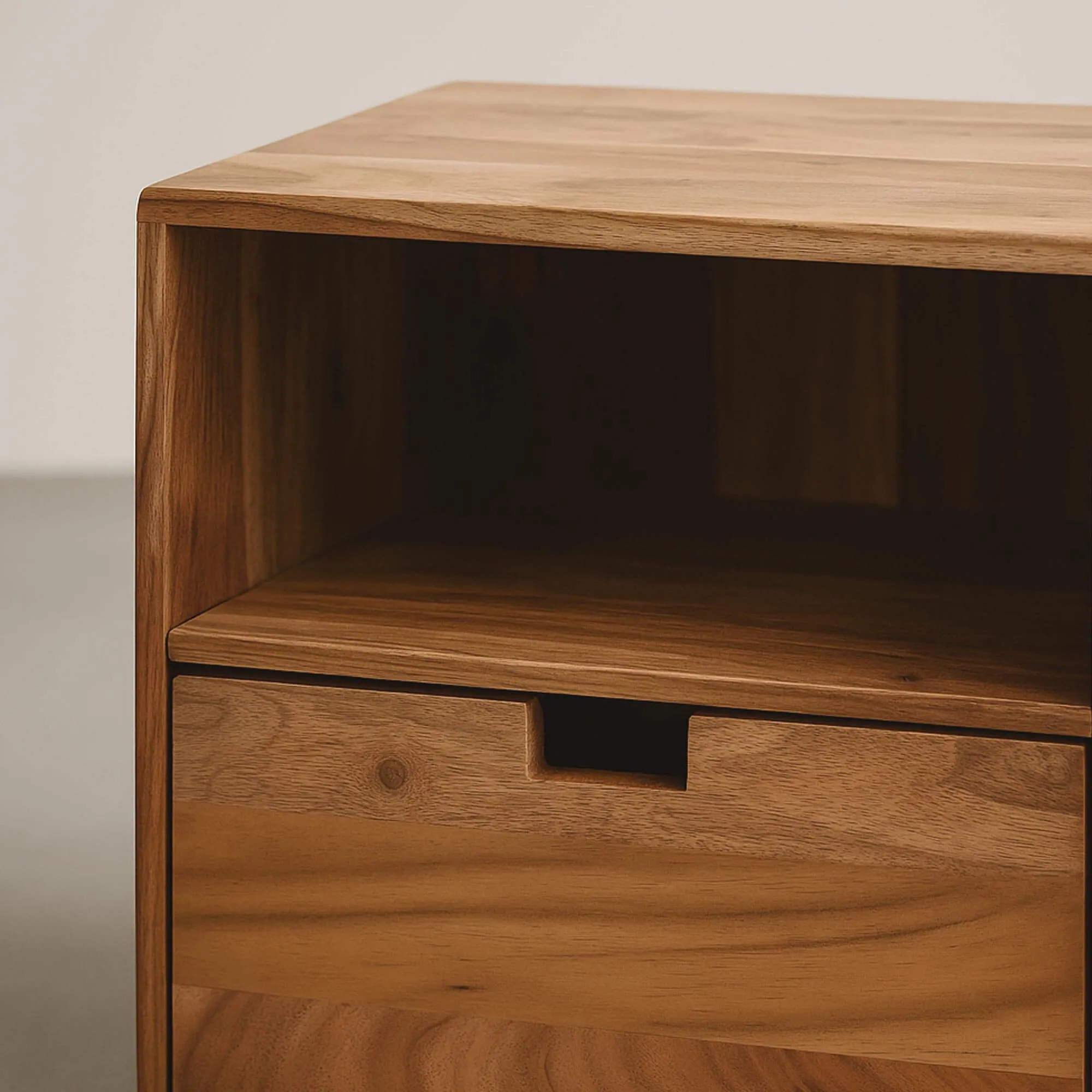 Réalisée en acacia massif, la table de chevet suspendue en bois Flat XS met en valeur une matière vivante, sélectionnée pour sa densité, sa résistance et ses nuances chaleureuses. Le veinage naturellement contrasté du bois apporte un relief subtil à la surface, tandis que les arêtes adoucies et les assemblages soignés témoignent du travail artisanal mené dans nos ateliers. Le toucher est franc, naturel, et la finition laisse respirer le bois, révélant toute sa profondeur au fil de la lumière.