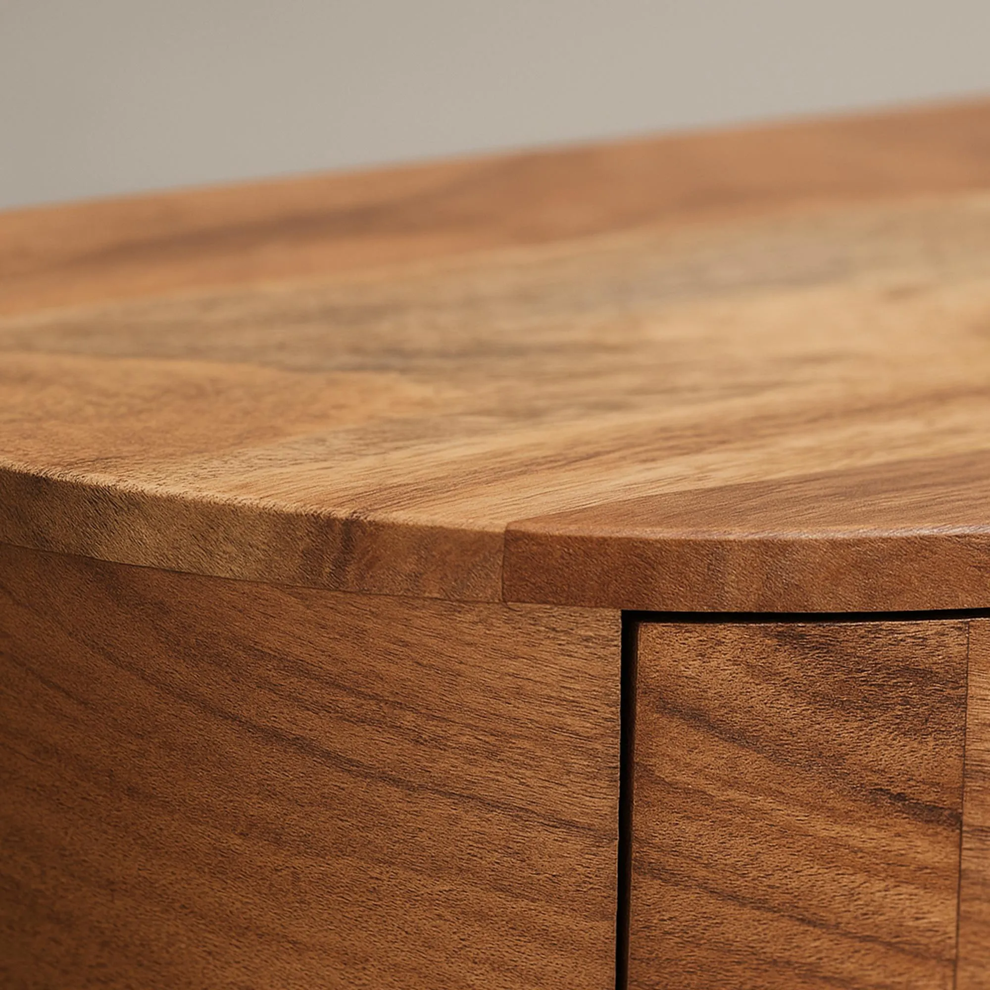 Réalisée de manière artisanale, notre table de chevet suspendue en bois massif d'acacia Curve met en valeur une essence choisie pour sa densité, sa résistance et la richesse de son veinage. Chaque pièce révèle des nuances chaleureuses et des variations subtiles qui rendent chaque table unique. Le toucher est doux, la finition soignée, et les chants arrondis renforcent cette sensation de confort visuel et tactile. Nous sommes particulièrement fiers de ce travail sur les courbes, qui demande précision et maîtrise artisanale pour conserver l’équilibre entre solidité et légèreté.