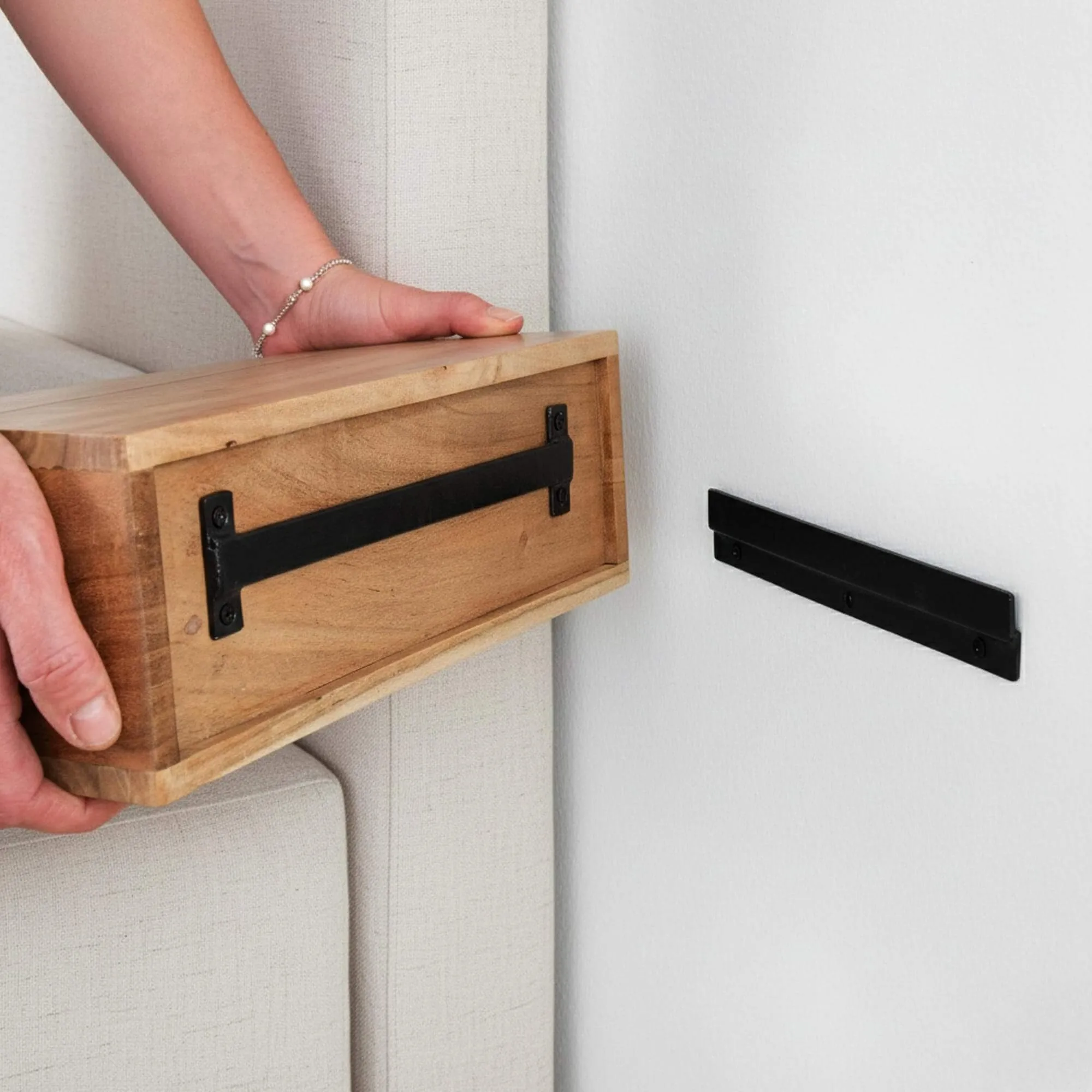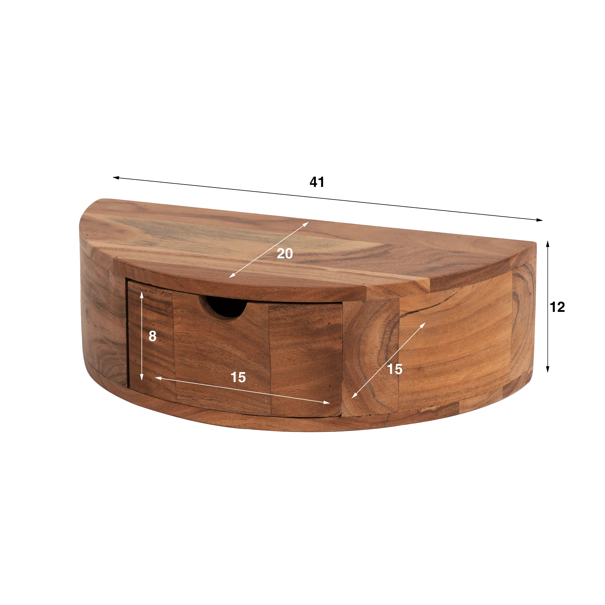 Avec sa largeur d’environ 41 cm, sa profondeur proche de 20 cm et sa hauteur de 12 cm, la table de chevet suspendue en bois massif d'acacia Curve offre un format idéal pour accompagner le lit sans encombrer la chambre. Le tiroir intégré, d’une largeur intérieure d’environ 15 cm et d’une hauteur utile de 8 cm, accueille facilement les indispensables du quotidien, tandis que le plateau supérieur permet de poser une lampe, un livre ou un objet décoratif. L’ouverture discrète du tiroir, directement façonnée dans le bois, participe à l’esthétique épurée de l’ensemble.