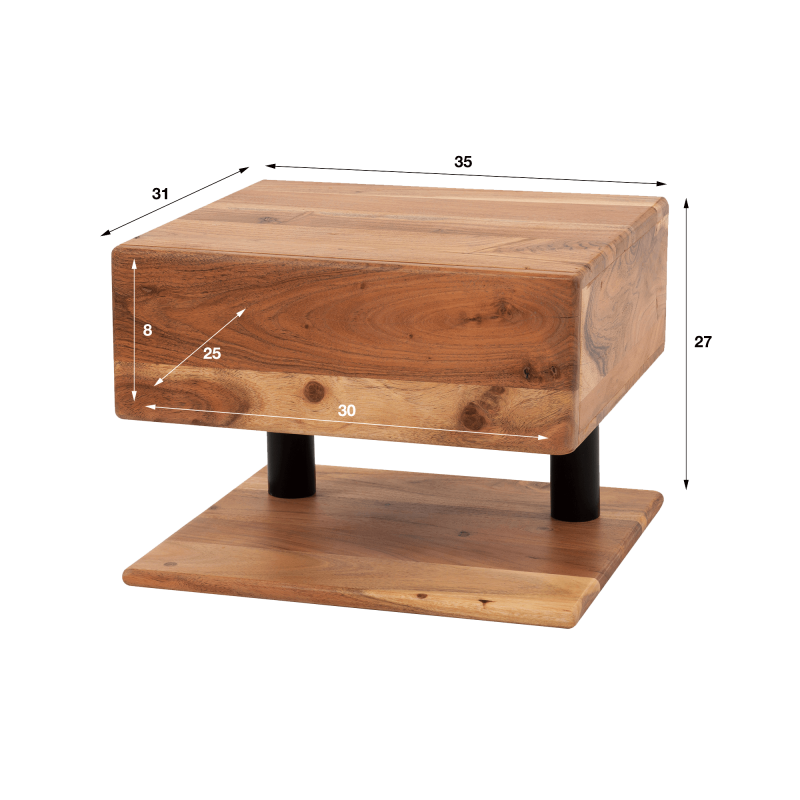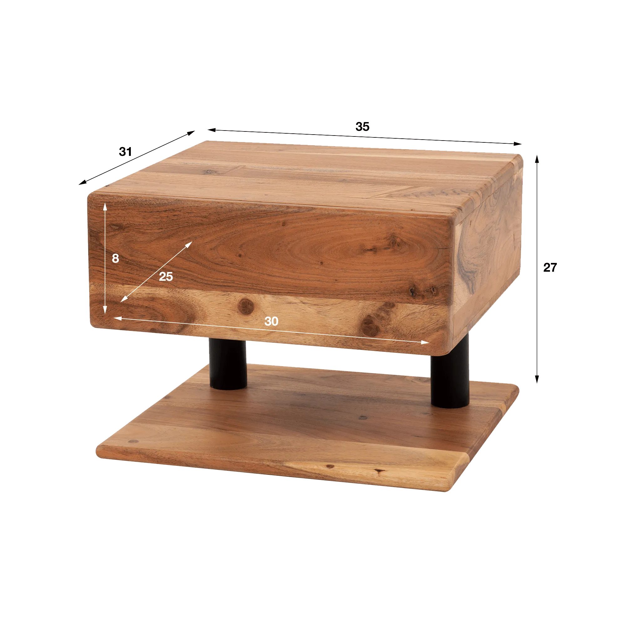 Taillée dans une belle épaisseur de bois, la table de chevet suspendue en bois massif d'acacia Shelve séduit par son équilibre visuel. Ses lignes franches et adoucies offrent une lecture claire du volume, tandis que la douceur du toucher révèle un travail soigné, fruit d’une fabrication artisanale attentive. La surface supérieure, aux proportions généreuses, accueille facilement une lampe, un livre ou quelques objets du quotidien, tandis que le tiroir intégré propose un rangement discret et fonctionnel. Avec une largeur d’environ 30 cm et une profondeur de 25 cm, l’ensemble reste compact tout en offrant un espace intérieur confortable, idéal pour garder l’essentiel à portée de main.
