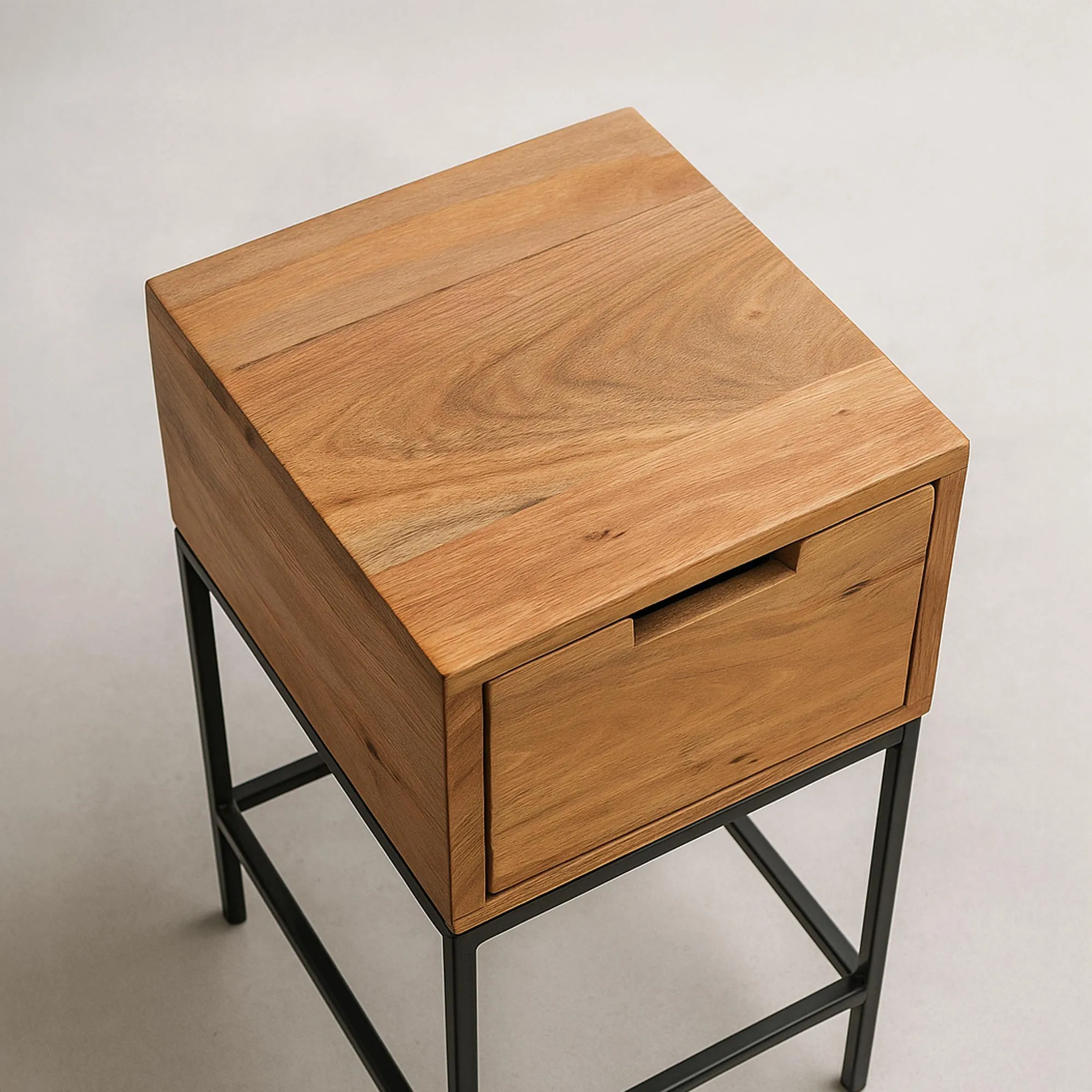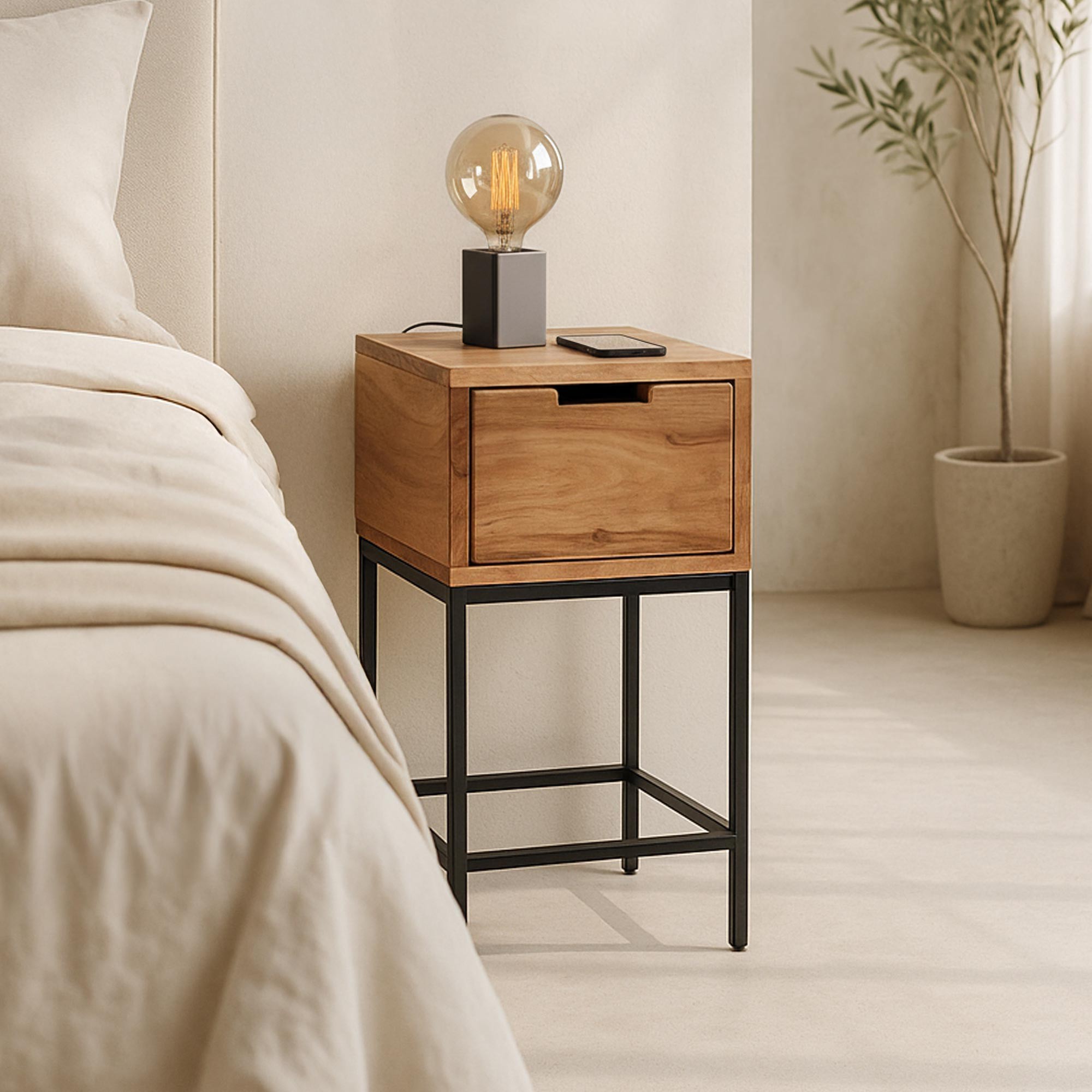 Nous avons imaginé cette table de chevet en bois et métal style industriel comme un compagnon discret de la chambre, capable de s’intégrer aussi bien dans une ambiance épurée que dans un intérieur à l’esprit industriel ou naturel. Son assemblage simple permet une installation rapide, sans compromis sur la solidité.