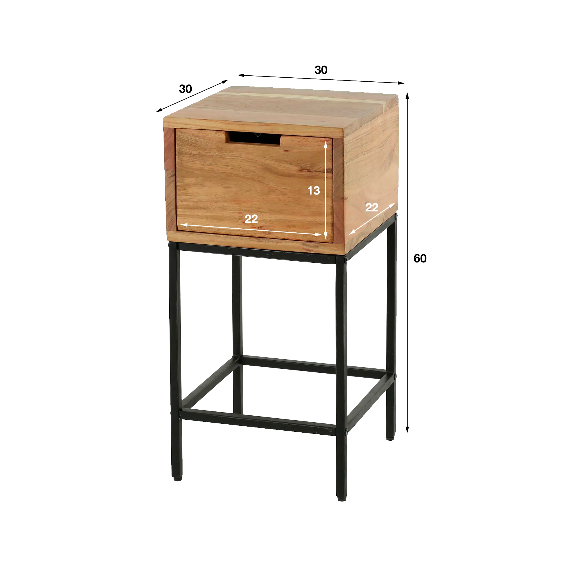 Fonctionnelle sans ostentation, la table de chevet intègre un tiroir aux proportions bien pensées, offrant environ 22 cm de largeur utile et 13 cm de hauteur intérieure. Il accueille facilement livres, lunettes ou objets personnels, tandis que le plateau supérieur de 30 x 30 cm reste disponible pour une lampe, un réveil ou un téléphone. Laa hauteur totale de cette table de chevet en bois et métal style industriel d’environ 60 cm permet une utilisation confortable, aussi bien avec un lit bas qu’un sommier plus haut.