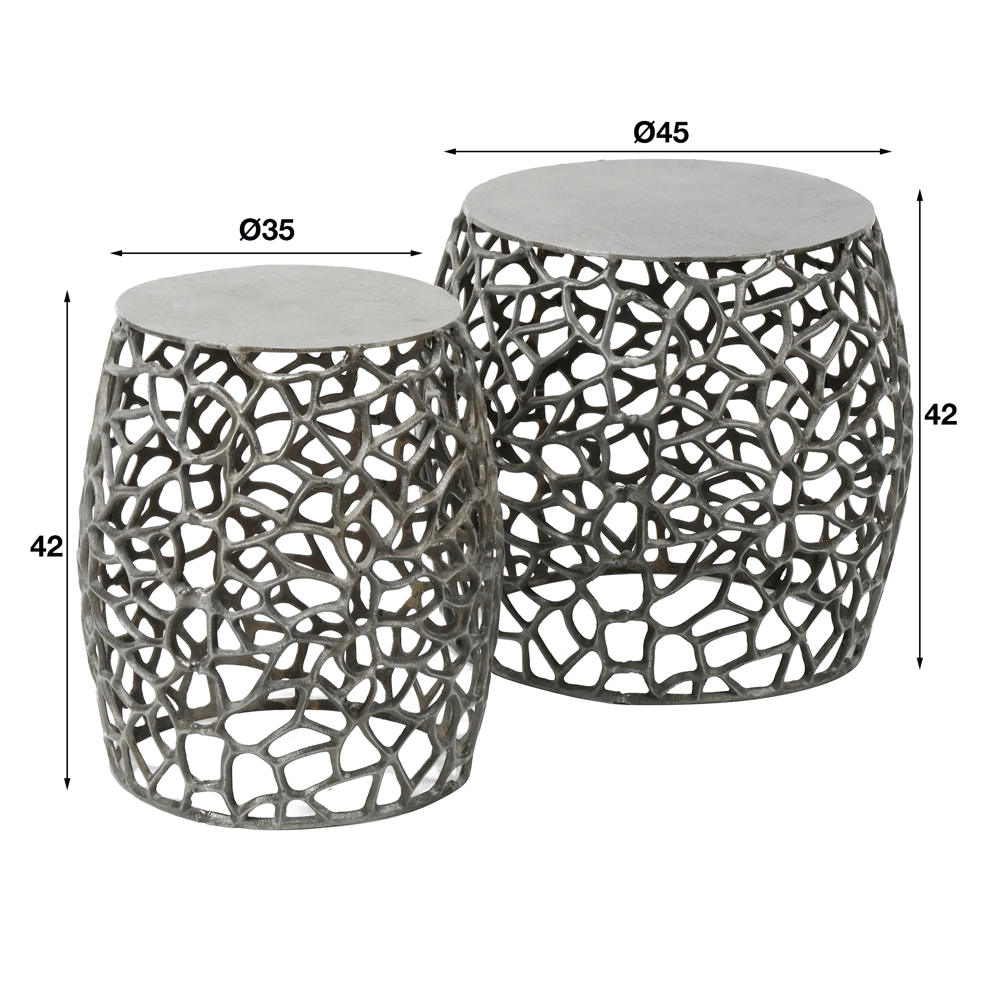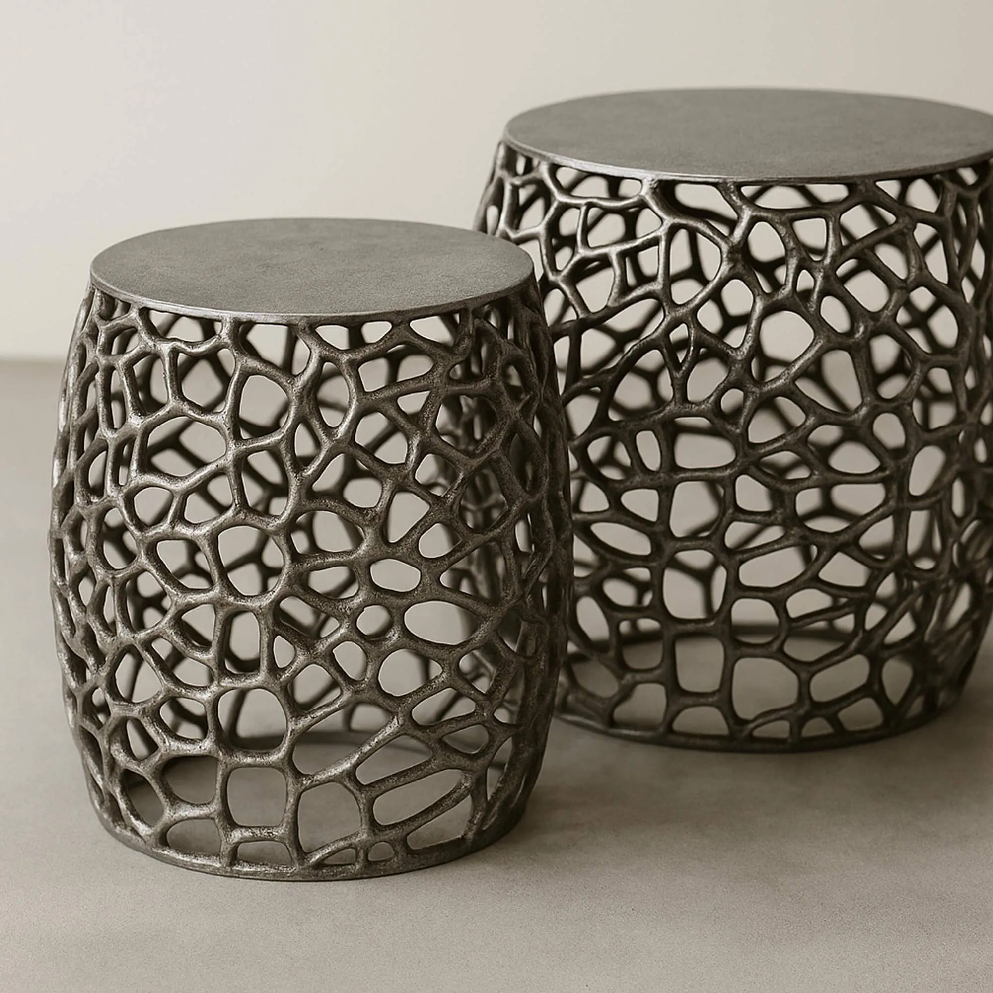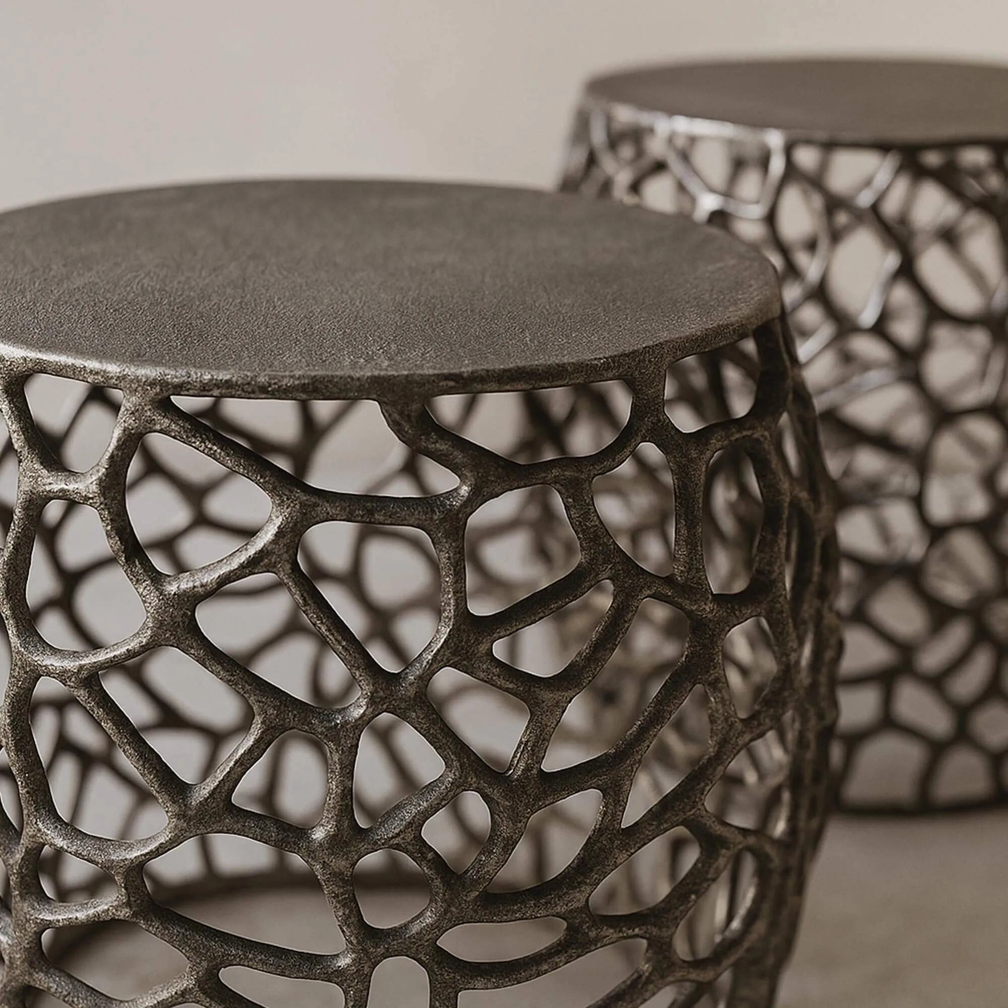 Nous avons imaginé le bout de canapé nickel noir avec plateau en aluminium Maze en lot de 2 comme une table d’appoint capable de dialoguer avec l’espace sans jamais l’alourdir. Dès les premières esquisses, nos designers ont cherché à traduire une inspiration puisée dans la nature, tout en conservant une écriture industrielle maîtrisée. De cette réflexion est né un duo de tables d’appoint en aluminium au fini nickel noir, dont la structure ajourée évoque un réseau organique, presque minéral, qui capte la lumière et anime la pièce.