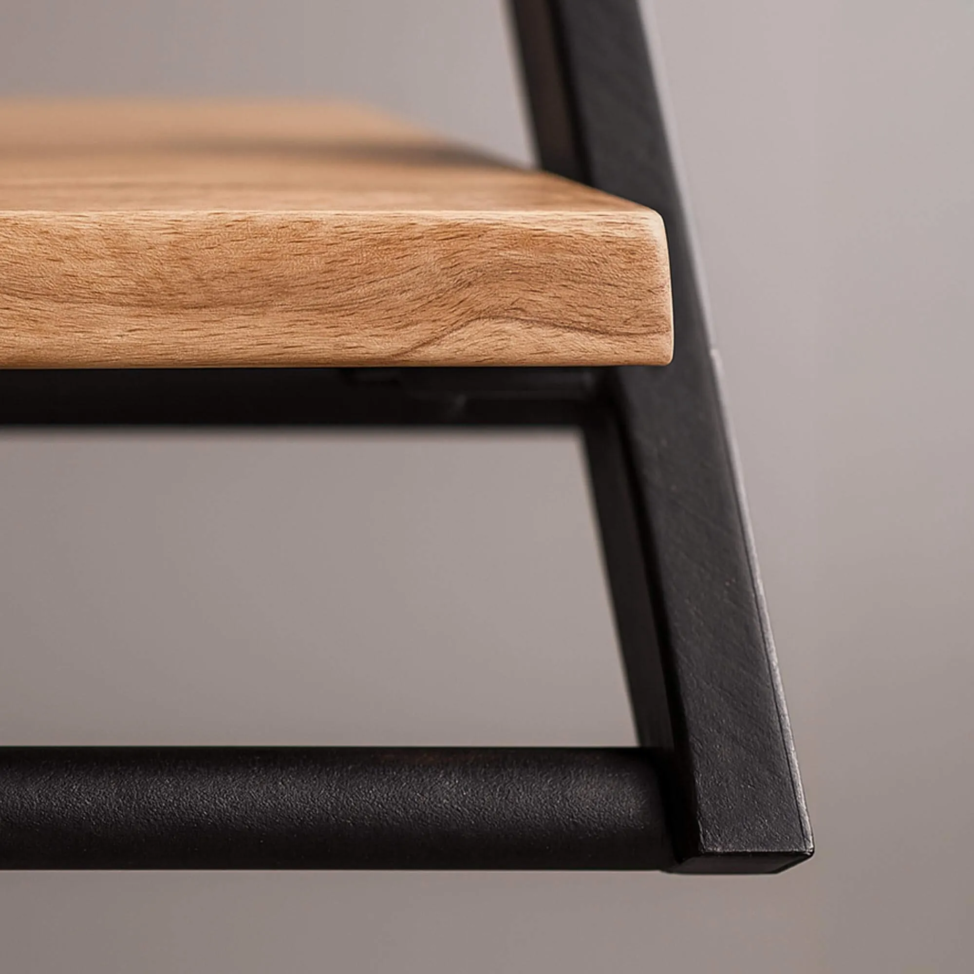 La structure en métal noir de ce porte manteaux mural en métal avec étagère en bois massif dessine une silhouette inclinée qui apporte un rythme visuel singulier au mur. Ce jeu de lignes, inspiré à la fois de l’univers industriel et d’une esthétique plus bohème, donne au porte manteaux mural en métal avec étagère en bois massif Lean une allure légère malgré sa construction robuste. Nous avons volontairement travaillé des sections fines et des angles maîtrisés pour que la structure semble flotter, tout en assurant une excellente stabilité une fois installée.