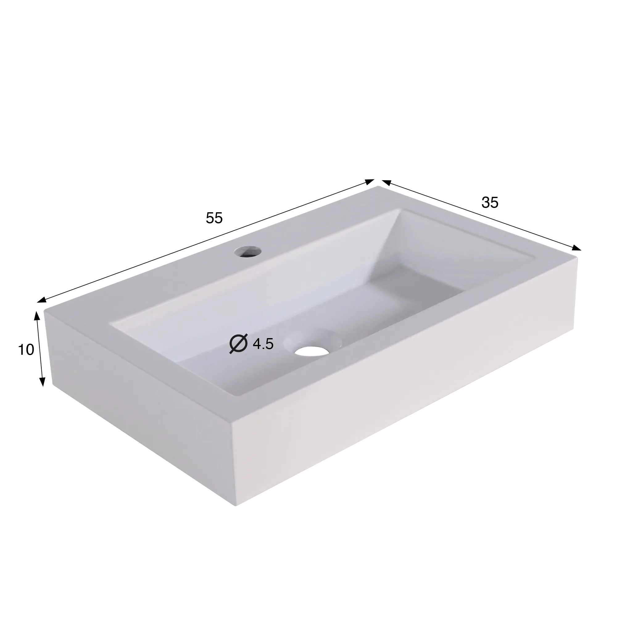 Avec ses dimensions généreuses de 55 cm de largeur pour 35 cm de profondeur et une hauteur de 10 cm, notre vasque à poser en céramique rectangulaire, blanc mat, Odon offre un espace d’eau bien proportionné, agréable à l’usage sans alourdir visuellement le meuble sur lequel elle repose. Le perçage discret pour la robinetterie ainsi que l’orifice d’évacuation central de 4,5 cm s’intègrent naturellement au dessin, sans rompre l’harmonie générale.