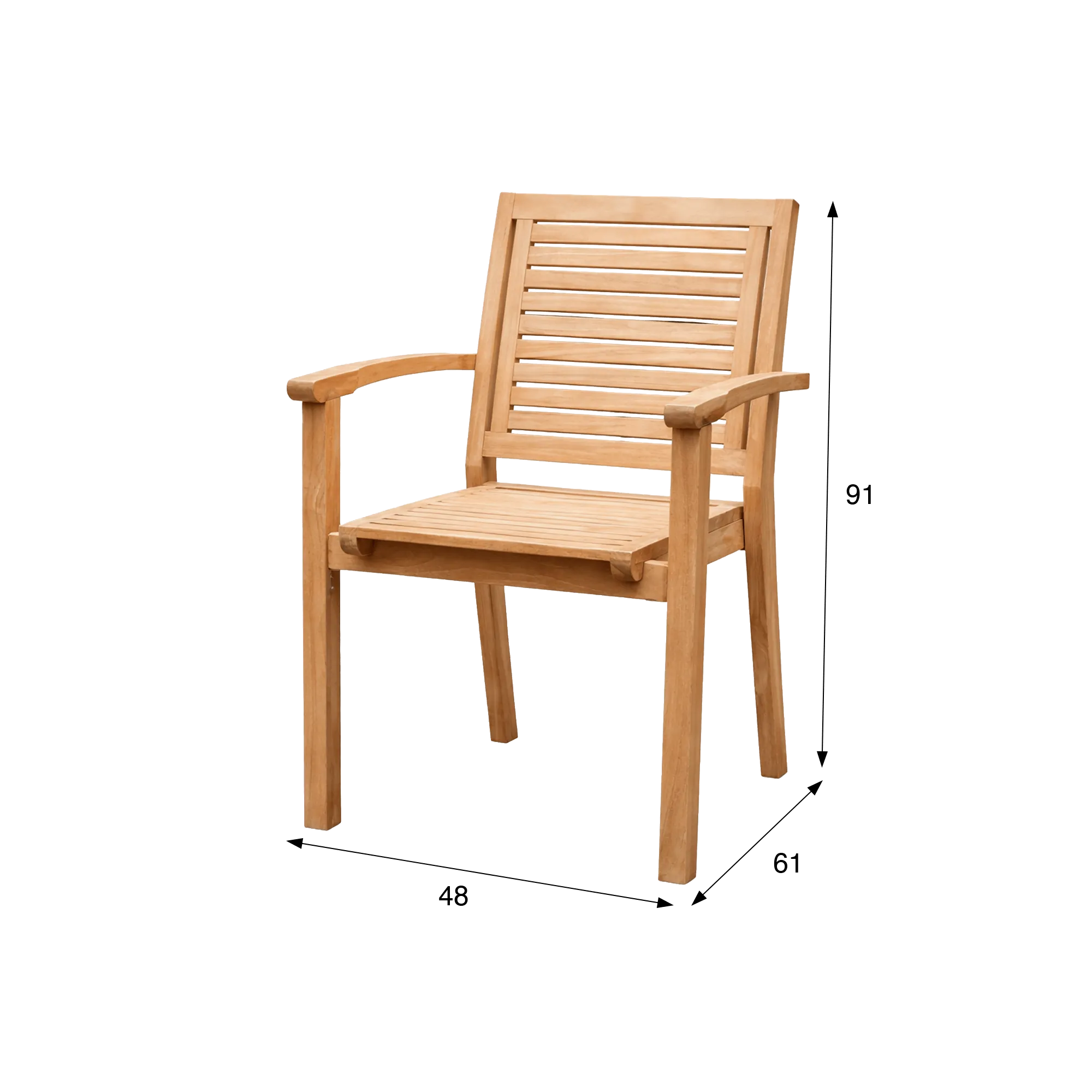 Le dossier de la chaise de jardin avec accoudoirs en bois de teck Tomo, légèrement incliné, et les accoudoirs soigneusement intégrés participent à une ergonomie étudiée pour offrir une assise agréable au quotidien. Les proportions ont été pensées pour créer une posture confortable, tout en conservant une silhouette harmonieuse. Avec des dimensions équilibrées de 48 cm de large, 61 cm de profondeur et 91 cm de haut, la chaise de jardin avec accoudoirs en bois de teck Tomo trouve facilement sa place autour d’une table de jardin ou en complément d’un espace de détente, sans alourdir la composition.