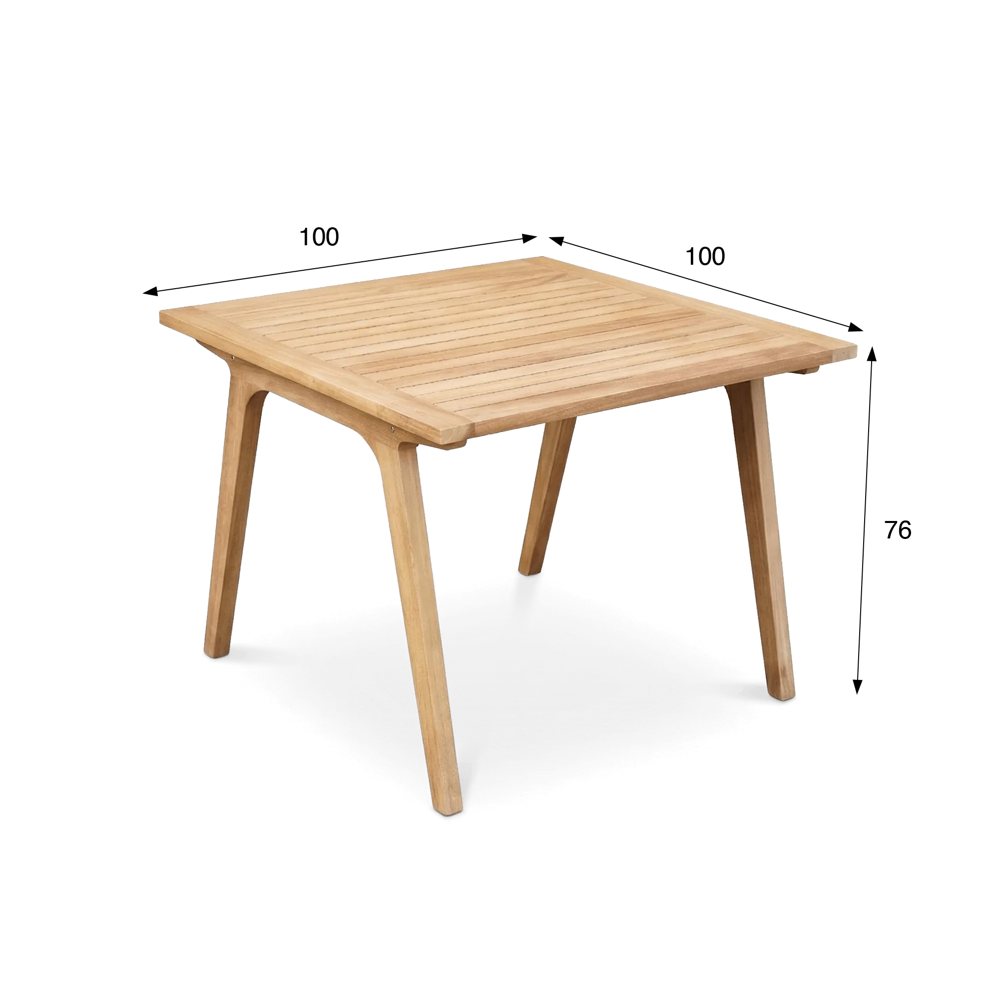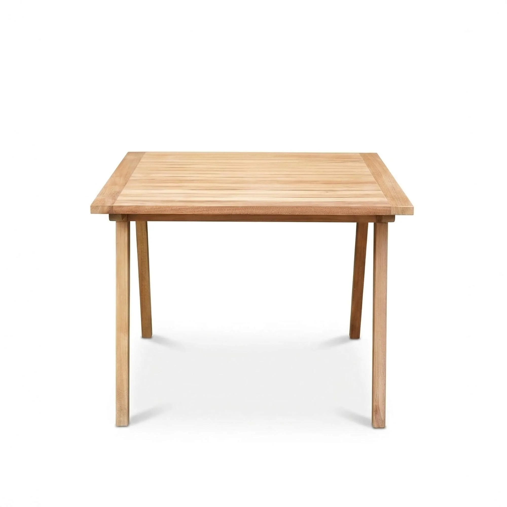 Le plateau de cette table de jardin carrée en bois de teck 4 personnes, structuré par de fines lattes soigneusement alignées, met en valeur la matière tout en facilitant l’écoulement de l’eau, un détail discret qui contribue à préserver durablement la qualité du bois en usage extérieur. Nous avons porté une attention particulière au dessin des pieds légèrement fuselés, dont l’inclinaison apporte une légèreté visuelle inspirée du style scandinave. Cette recherche d’équilibre entre stabilité et finesse confère à la table de jardin carrée en bois de teck 4 personnes Roku une présence naturelle, facile à intégrer dans un environnement contemporain comme dans une ambiance plus authentique.