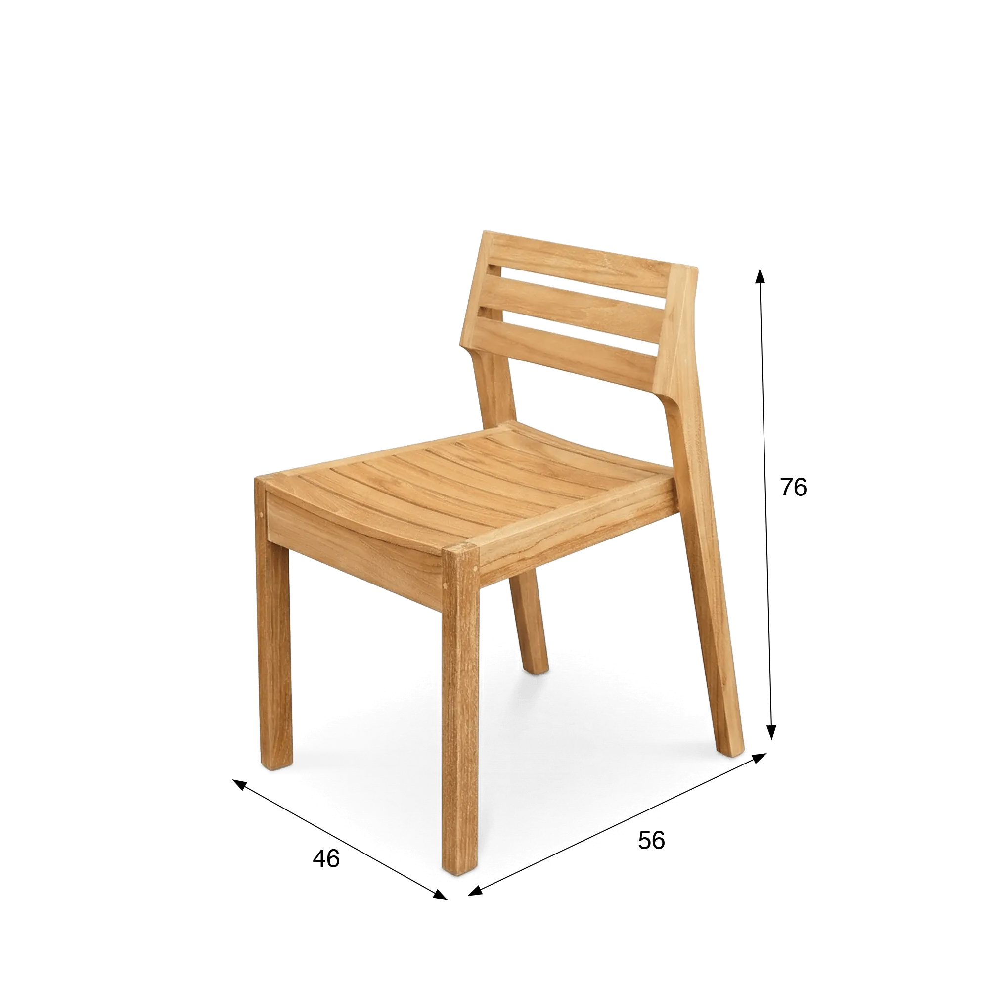 Le dessin du dossier de la chaise de jardin pour extérieur en bois de teck Roku, légèrement incliné, accompagne naturellement le dos, tandis que l’assise subtilement galbée offre une sensation d’accueil immédiate. Chaque latte de teck a été soigneusement positionnée pour favoriser à la fois l’esthétique et l’écoulement de l’eau, un détail essentiel pour préserver la qualité du bois face aux conditions extérieures. Les proportions équilibrées de cette chaise de jardin pour extérieur en bois de teck – 46 cm de largeur pour une profondeur proche de 56 cm et une hauteur totale de 76 cm – permettent une installation confortable autour d’une table de jardin, sans alourdir visuellement l’espace.