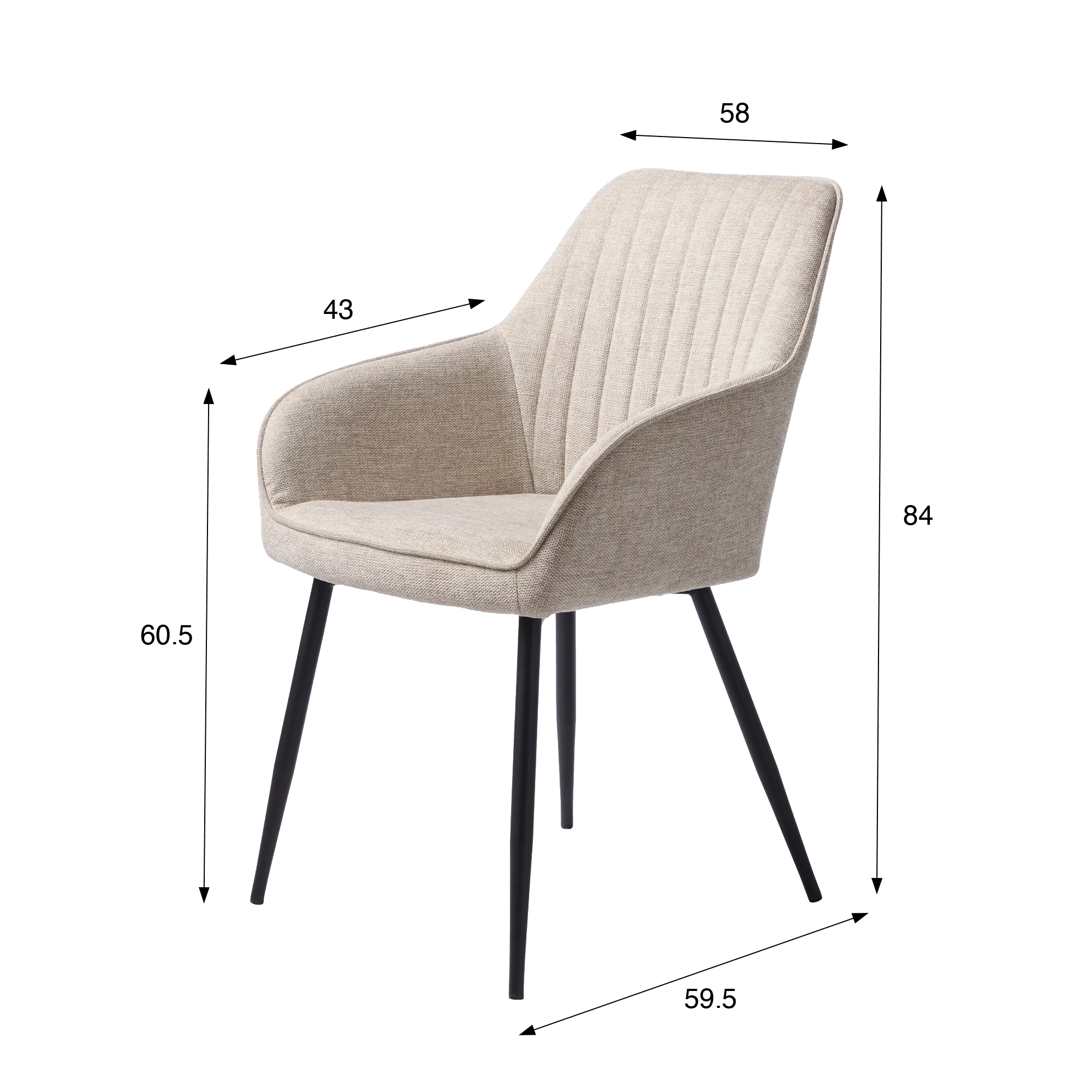 La coque de l’assise de cette chaise de salle à manger en tissu est généreusement rembourrée et habillée d’un tissu résistant, pensé pour accompagner le quotidien sans se fragiliser. Les surpiqûres verticales qui rythment le dossier allongent la silhouette et rappellent les codes du design scandinave : simple, chaleureux, fonctionnel. Nous avons travaillé les accoudoirs pour qu’ils soutiennent confortablement les bras sans gêner le passage sous la table, avec une hauteur d’environ 60,5 cm.