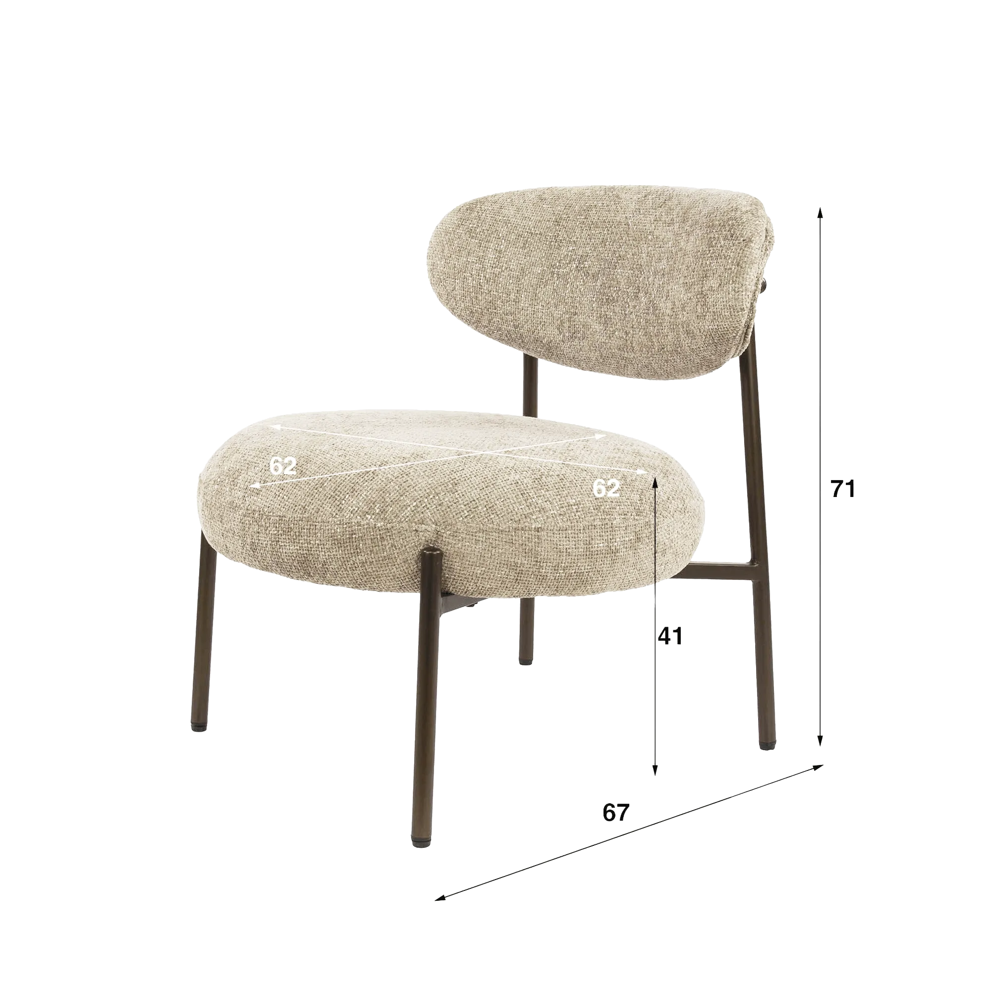 L’assise généreuse et le dossier légèrement galbé de ce fauteuil lounge de salon sont habillés d’un tissu bouclette à la texture subtilement irrégulière. Son toucher chaleureux et sa bonne tenue dans le temps en font un allié du quotidien, aussi agréable visuellement qu’à l’usage. La profondeur de l’assise, associée à une hauteur d’environ 41 cm, permet une posture détendue, idéale pour lire, discuter ou simplement profiter d’un moment de calme. Avec une largeur d’assise proche de 62 cm et une hauteur totale d’environ 71 cm, le fauteuil lounge de salon Mellow trouve naturellement sa place sans encombrer la pièce.