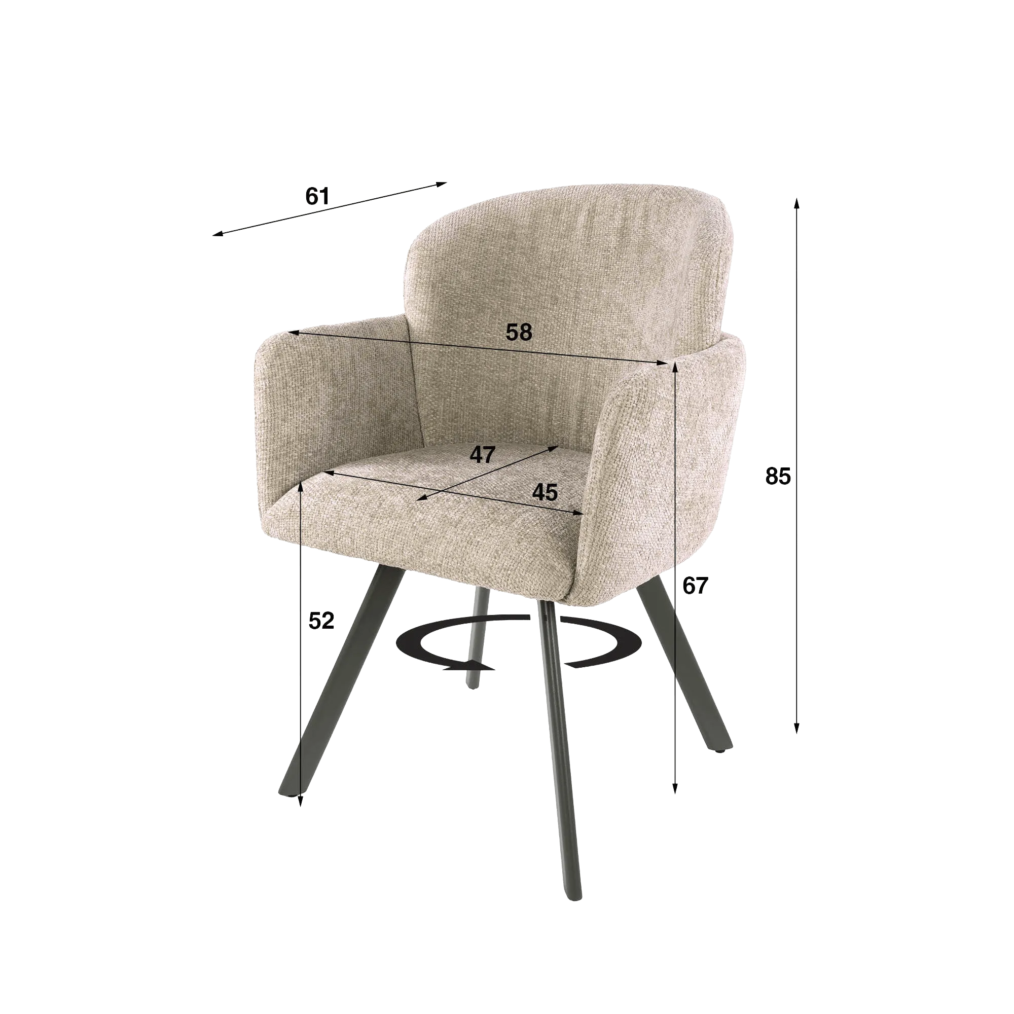 L'assise généreuse de ce fauteuil pivotant, habillée d’un tissu à la texture dense et agréable au toucher, enveloppe le corps avec douceur. Nous avons porté une attention particulière à la tenue du revêtement, sélectionné pour sa résistance et sa capacité à conserver son aspect au fil du temps. Le dossier légèrement galbé et les accoudoirs intégrés accompagnent naturellement les mouvements, invitant à prolonger les moments partagés autour de la table. Avec une hauteur totale d’environ 85 cm et une largeur confortable avoisinant les 61 cm, le fauteuil pivotant Navi offre un équilibre juste entre présence affirmée et légèreté visuelle.