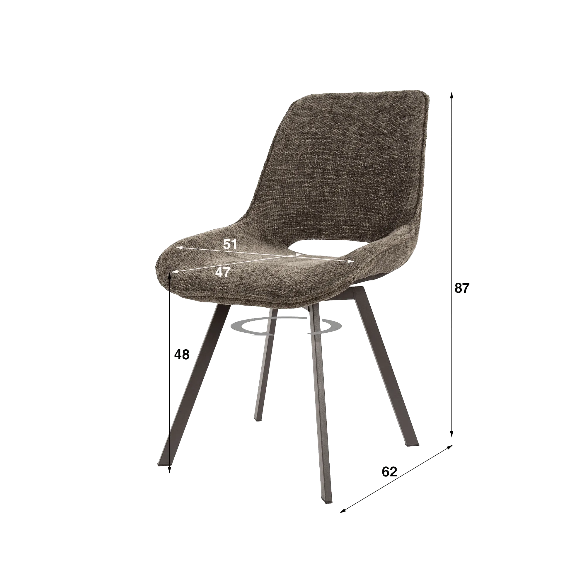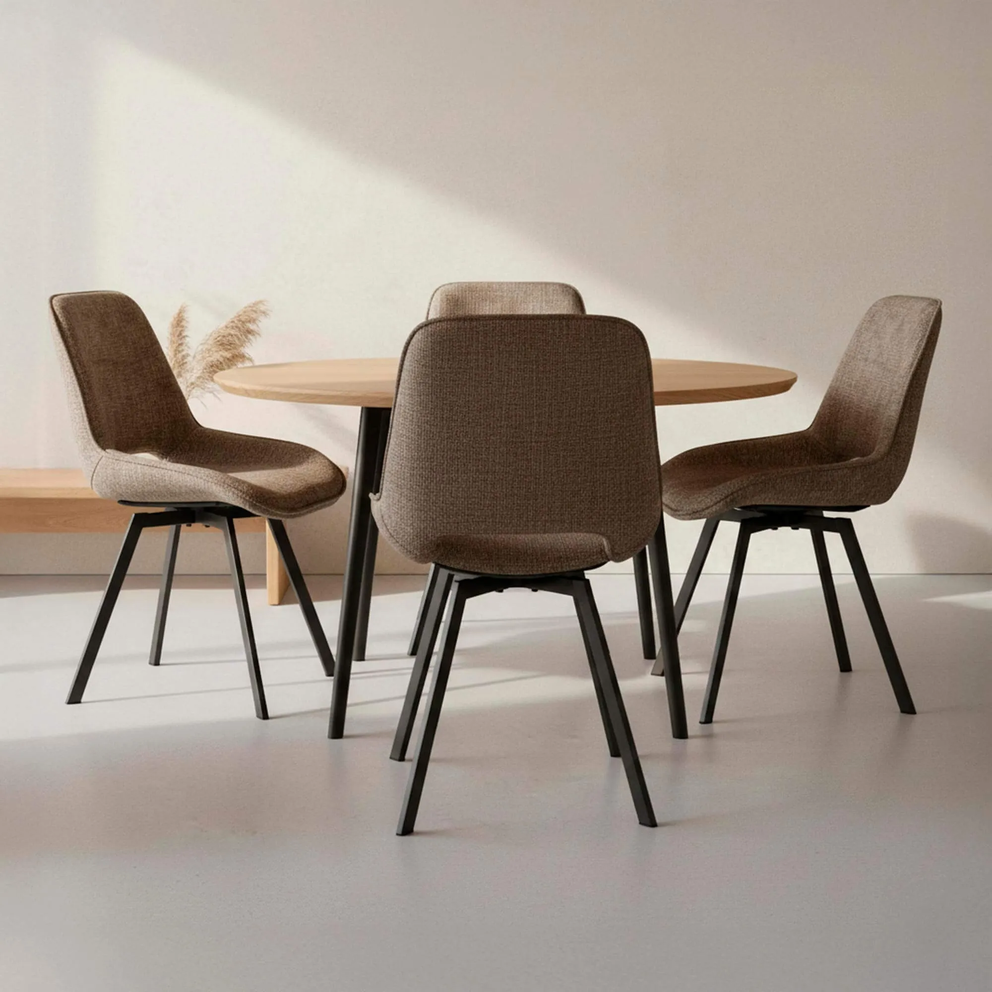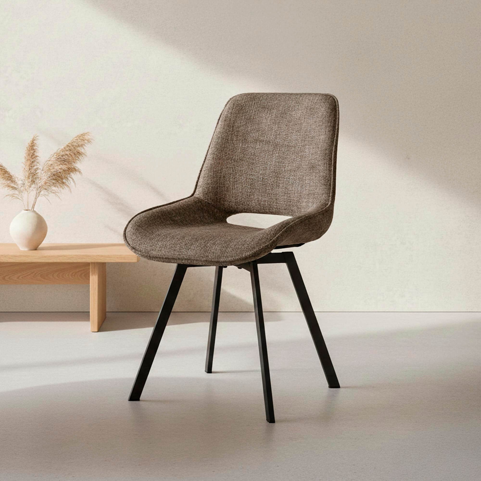 Le revêtement textile sélectionné pour ce fauteuil pivotant design pour salle à manger se distingue par son toucher texturé et sa résistance à l’usage quotidien. Nous avons volontairement opté pour une teinte chaleureuse et nuancée, capable de dialoguer facilement avec des plateaux bois, céramique ou pierre, tout en conservant une présence douce dans l’espace. La structure interne et la base pivotante assurent une rotation fluide et stable, renforçant l’ergonomie globale du fauteuil. La hauteur totale avoisinant 87 cm et une hauteur d’assise autour de 48 cm permettent une compatibilité naturelle avec la majorité des tables de salle à manger contemporaines.