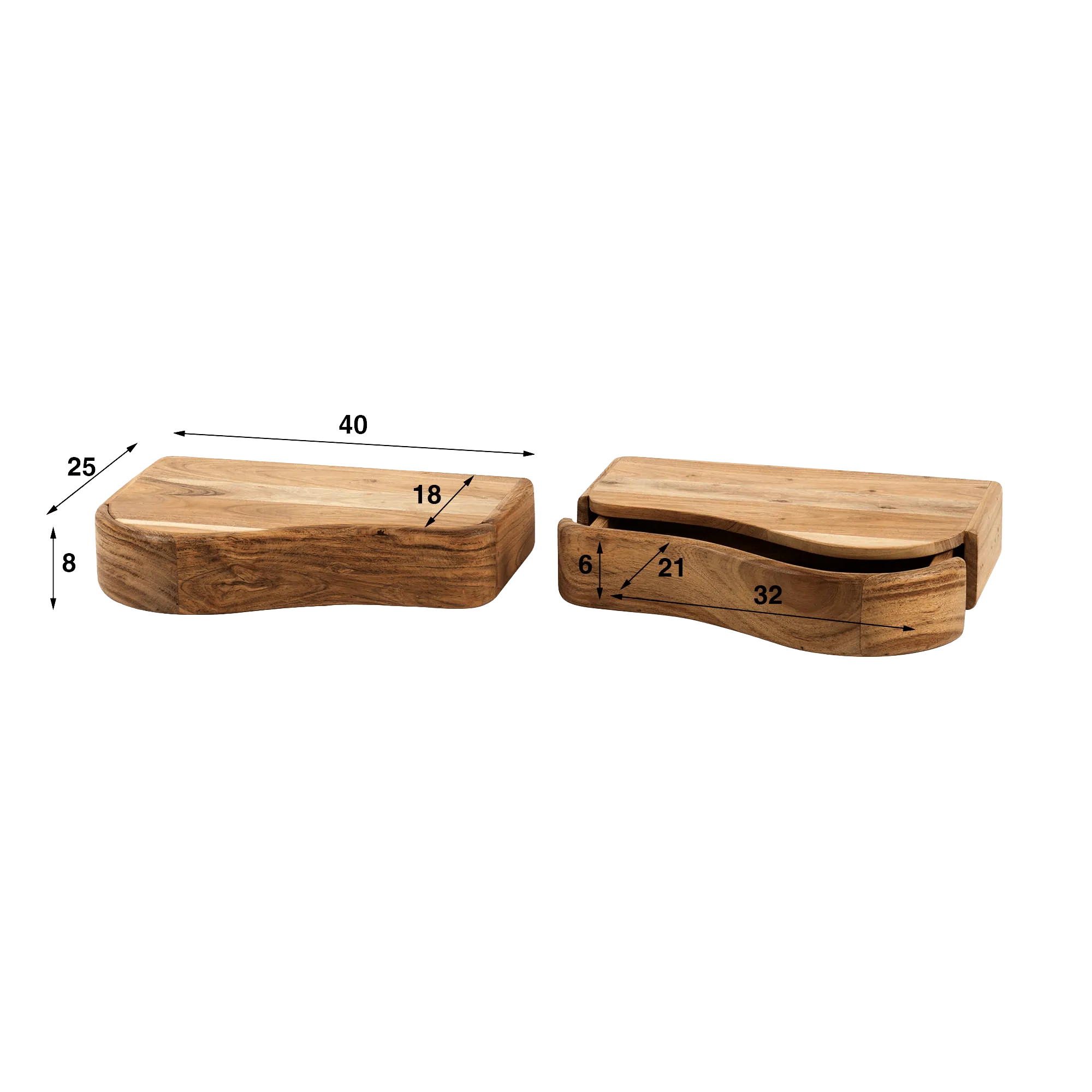 Réalisée en bois masif d’acacia, cette table de chevet en bois naturel à suspendre révèle toute la richesse de cette essence réputée pour sa solidité et son veinage expressif. Chaque pièce présente ses propres nuances, parfois dorées, parfois plus profondes, qui témoignent du caractère vivant du matériau. Nous avons choisi de conserver ces variations naturelles afin de préserver l’authenticité du bois et de donner au meuble une personnalité unique. La finition met en valeur la texture soyeuse de la surface et souligne les lignes généreuses du plateau.