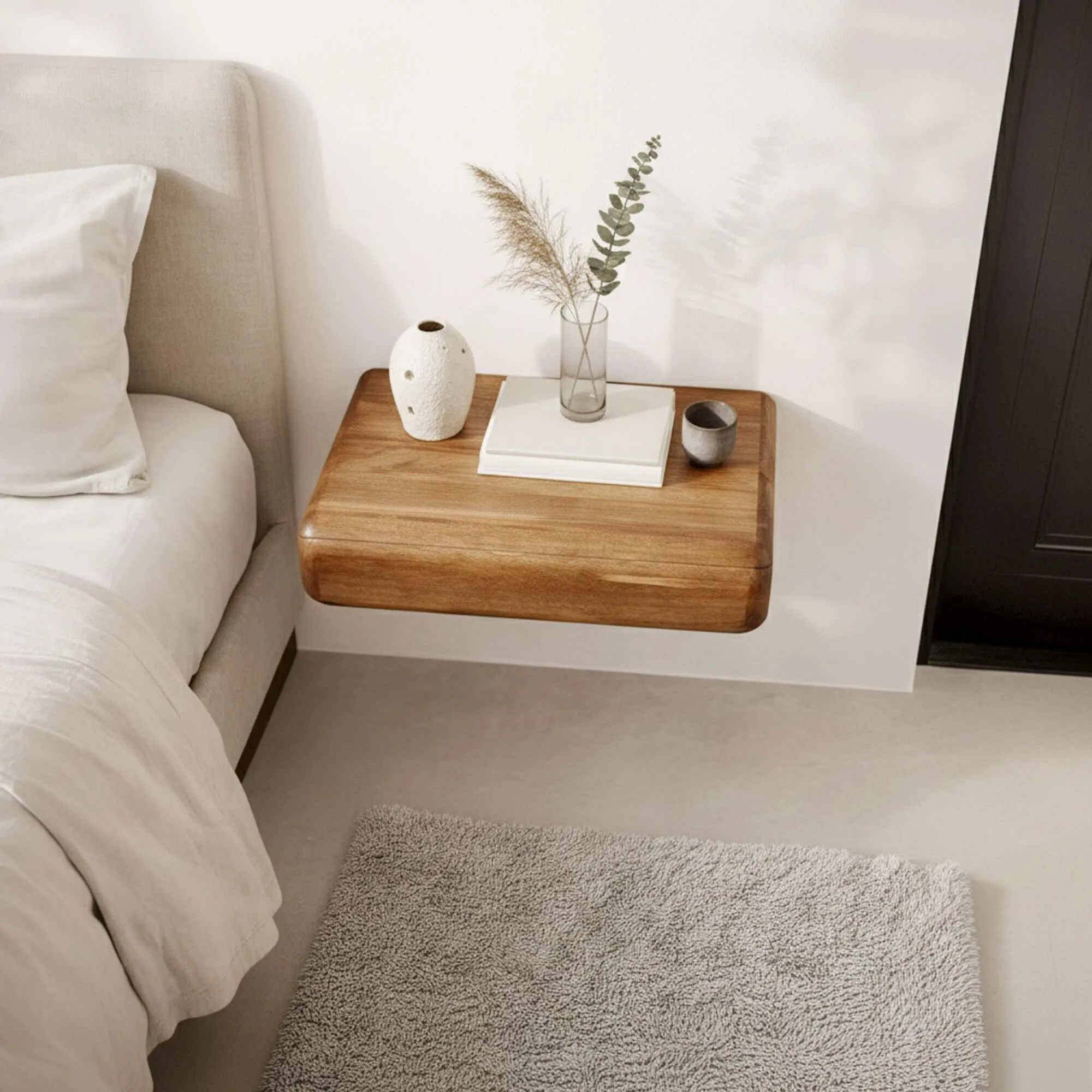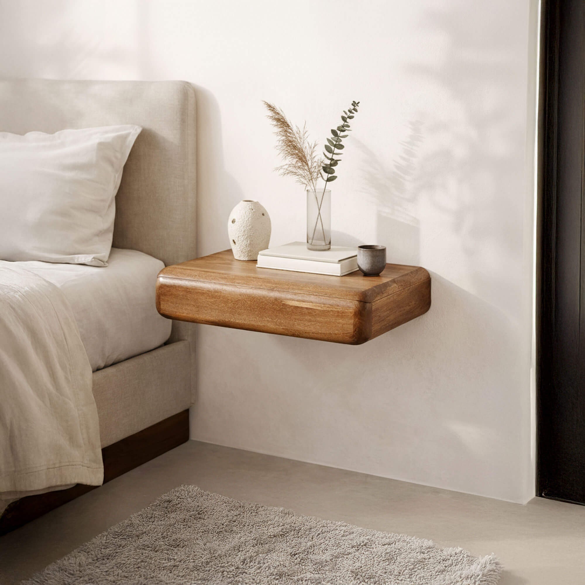 Livrée déjà montée, la table de chevet suspendue en bois massif avec tiroir Elia simplifie l’installation et permet une mise en place rapide. Nous avons voulu un meuble facile à vivre, capable de s’intégrer aussi bien dans une chambre minimaliste que dans un intérieur plus chaleureux mêlant textiles naturels, rotin ou lin.
