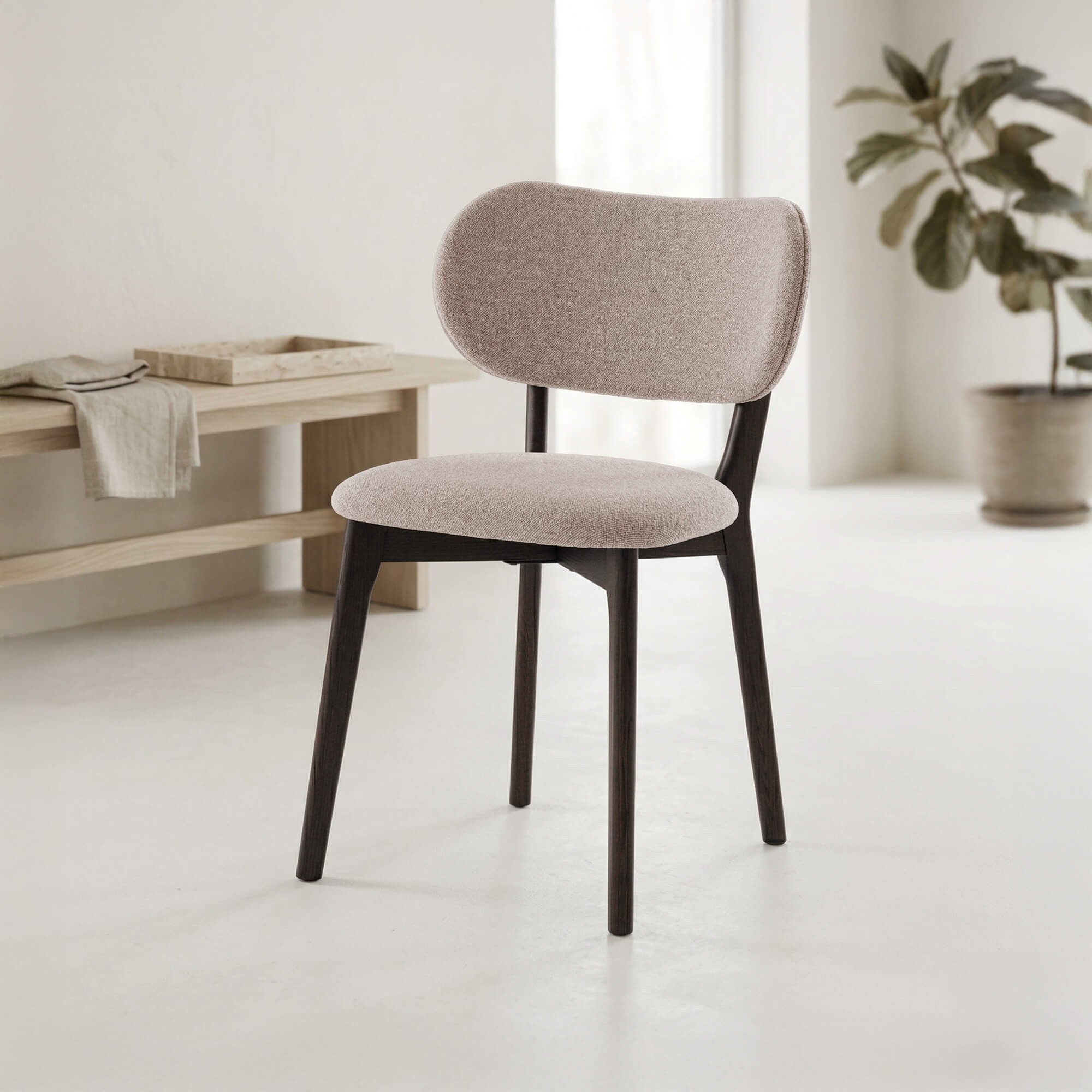 La chaise de salle à manger en bois de chêne et tissu taupe Stilo s’intègre naturellement dans une salle à manger lumineuse, un intérieur contemporain ou une ambiance plus feutrée, où elle apporte une touche chaleureuse sans surcharger l’espace. Sa teinte profonde dialogue facilement avec des matières naturelles, créant une atmosphère apaisante propice aux instants partagés.