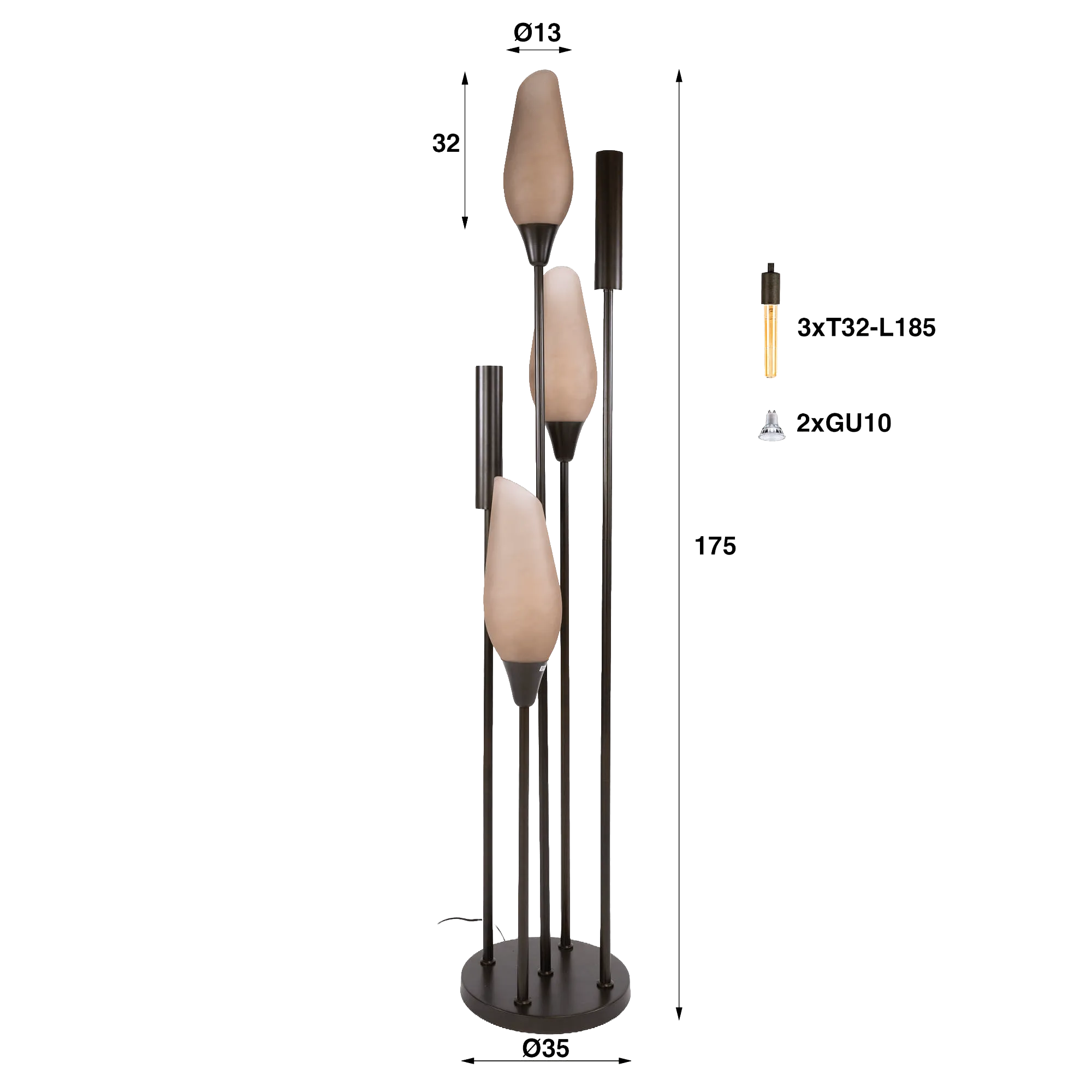 Lors de la conception de ce lampadaire design en métal brun et abat-jour en verre opalin, nous avons choisi le métal brun pour sa profondeur subtile et son toucher légèrement texturé, qui capte la lumière sans la réfléchir excessivement. Cette finition met en valeur la douceur du verre opalin soufflé à la main, dont la surface satinée filtre l’éclairage avec nuance et régularité. Chaque abat-jour (ampoules [T32-L185] et spots dimmables non inclus) de ce lampadaire design en métal brun, d’environ 32 cm de hauteur pour un diamètre de 13 cm, diffuse une clarté enveloppante qui évite l’éblouissement et favorise une ambiance apaisante. La base circulaire de 35 cm assure une stabilité fiable tout en renforçant l’équilibre des proportions.