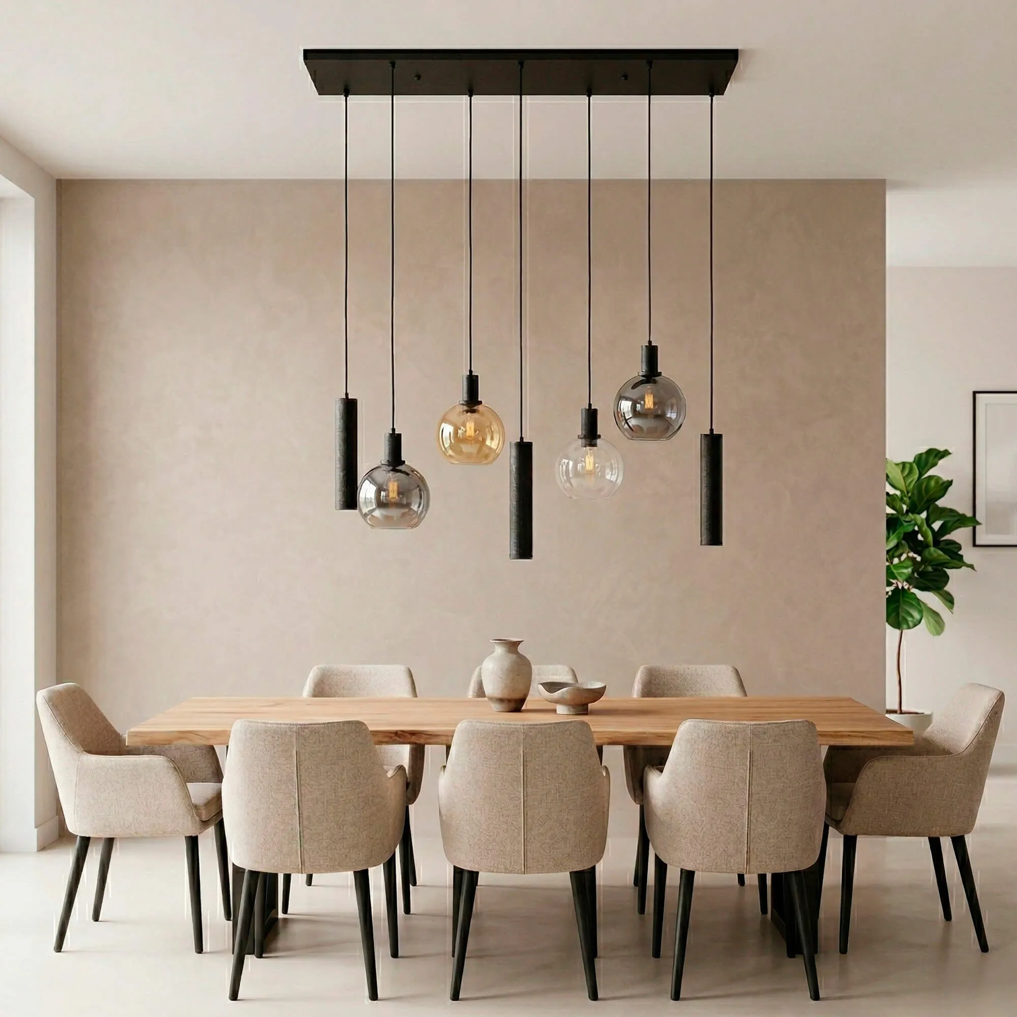 La structure horizontale de 100 cm de ce luminaire en suspension avec abat-jour en verre et métal noir permet d’accompagner élégamment une table à manger ou un îlot central, tandis que la hauteur maximale de 150 cm offre une grande liberté d’installation. Chaque diffuseur sphérique d’environ 18 cm de diamètre accueille une ampoule G70 (non incluse) qui met en valeur la profondeur du verre travaillé artisanalement. Les cylindres en métal noir, quant à eux, accueillent des sources GU10 (non incluses), diffusant un éclairage plus ciblé qui souligne la matière et crée un contraste harmonieux entre lumière d’ambiance et lumière fonctionnelle.