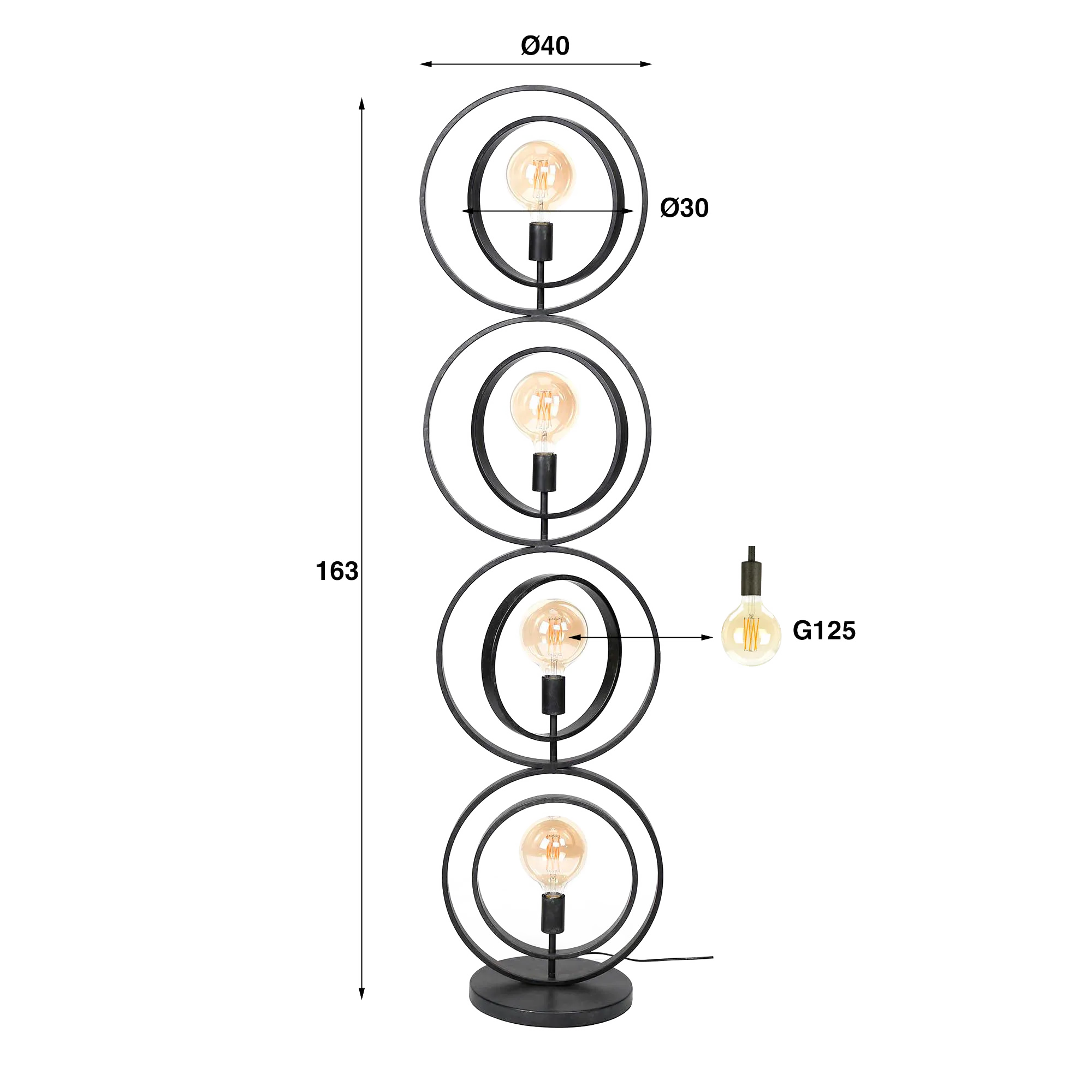 La silhouette élancée, d’environ 163 cm de hauteur pour 40 cm de diamètre, s’intègre naturellement dans un salon ou un espace de lecture. Les anneaux mobiles permettent de moduler subtilement l’orientation des formes, créant un jeu de perspectives qui évolue selon votre aménagement. Chaque source lumineuse accueille une ampoule G125 (non incluse), dont la lumière chaleureuse met en valeur la profondeur de la finition noir ou beige, révélant les nuances du métal travaillé avec précision.