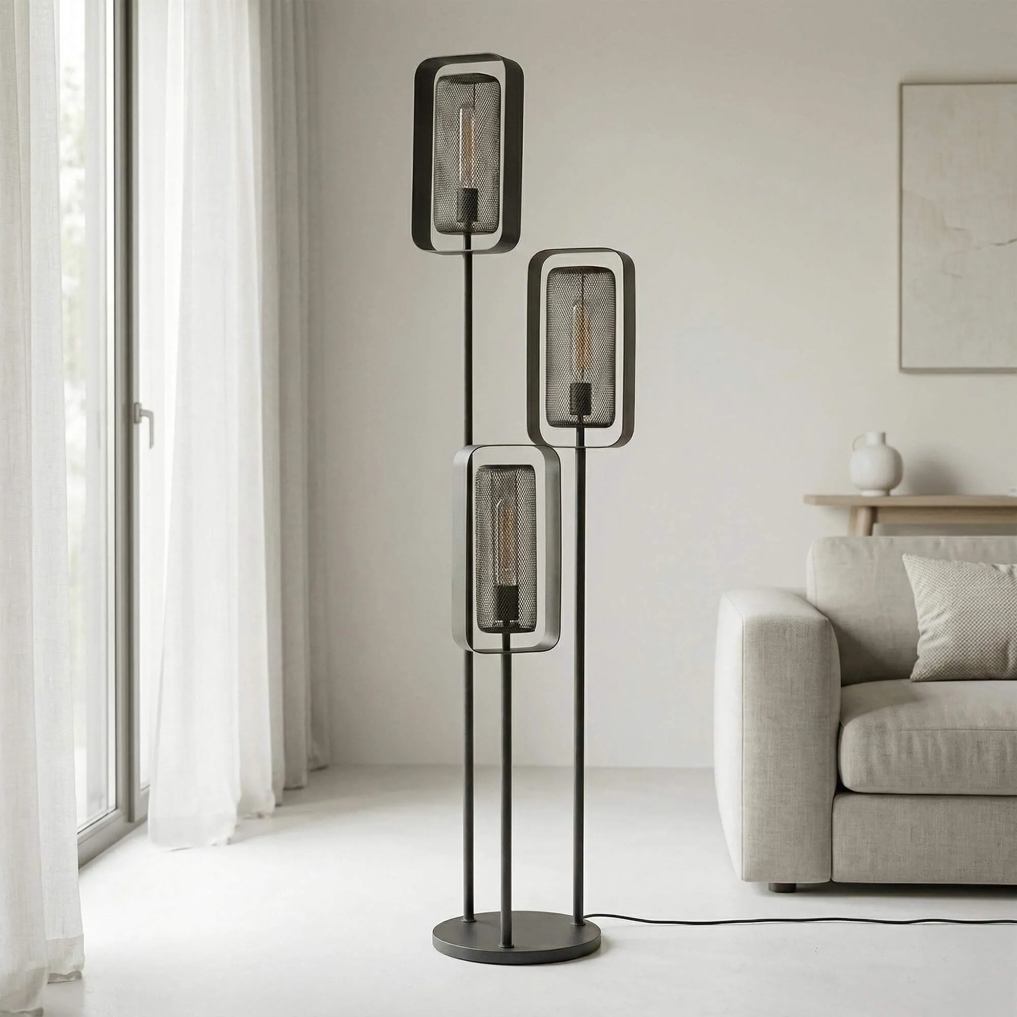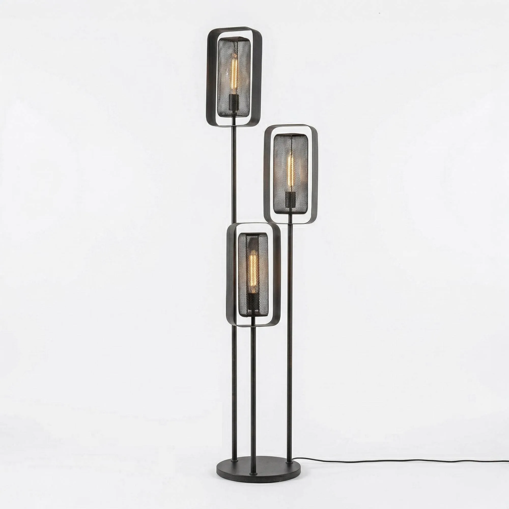 En imaginant le lampadaire de salon en métal style industriel Mesh Rotate, nous avons cherché à traduire l’esprit industriel dans une forme contemporaine, capable d’apporter à la fois caractère et douceur lumineuse à l’espace de vie. Sa silhouette verticale s’organise autour de trois sources lumineuses disposées à différentes hauteurs, créant un rythme visuel subtil qui attire le regard sans jamais surcharger l’ensemble. Cette composition élancée, culminant à environ 170 cm pour une base de 42 cm de diamètre, permet d’occuper l’espace avec justesse tout en conservant une sensation de légèreté.