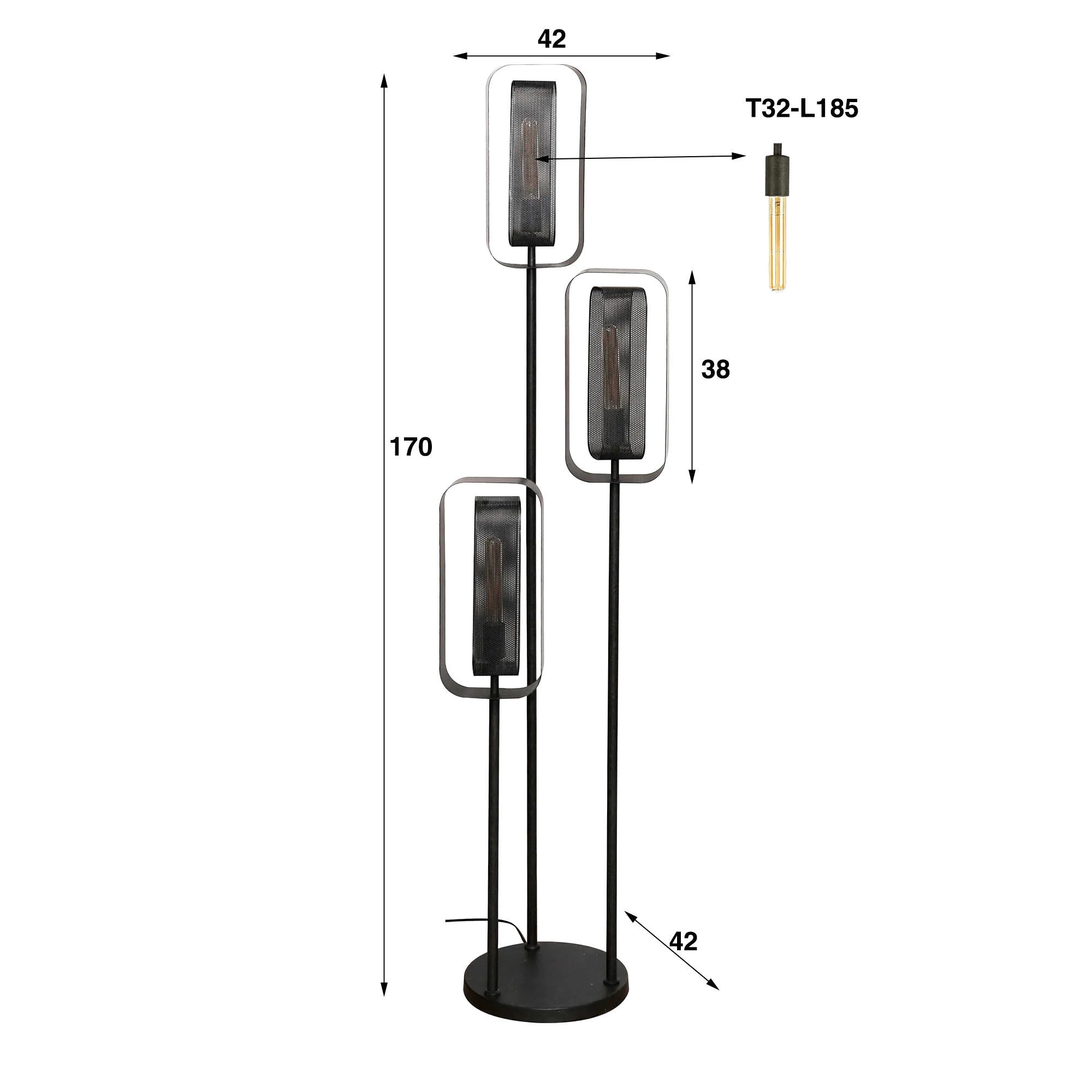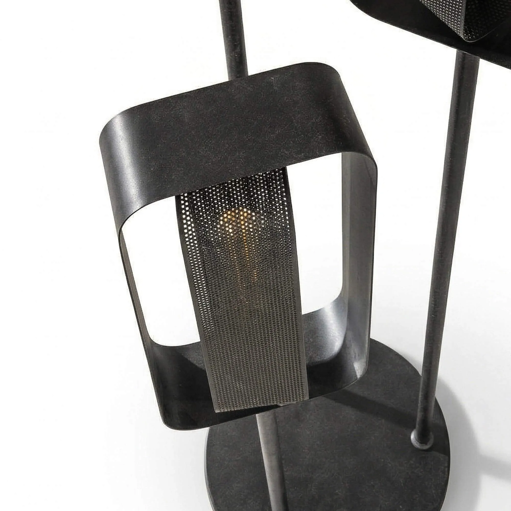 Le métal noir qui compose ce lampadaire de salon en métal style industrielrévèle ici toute sa richesse esthétique. Nous avons travaillé une structure sobre et équilibrée, associée à des diffuseurs en maille perforée abritant des ampoule à filament T32-L185 (non incluses) qui filtrent la lumière avec délicatesse. Cette texture laisse apparaître une lueur chaleureuse, douce et enveloppante, idéale pour accompagner un moment de détente dans un salon ou souligner l’atmosphère feutrée d’un intérieur contemporain. Chaque module lumineux de ce lampadaire de salon en métal style industriel, d’environ 38 cm de hauteur, crée un jeu de transparence qui évolue selon l’angle d’observation, apportant une dimension vivante à l’objet.