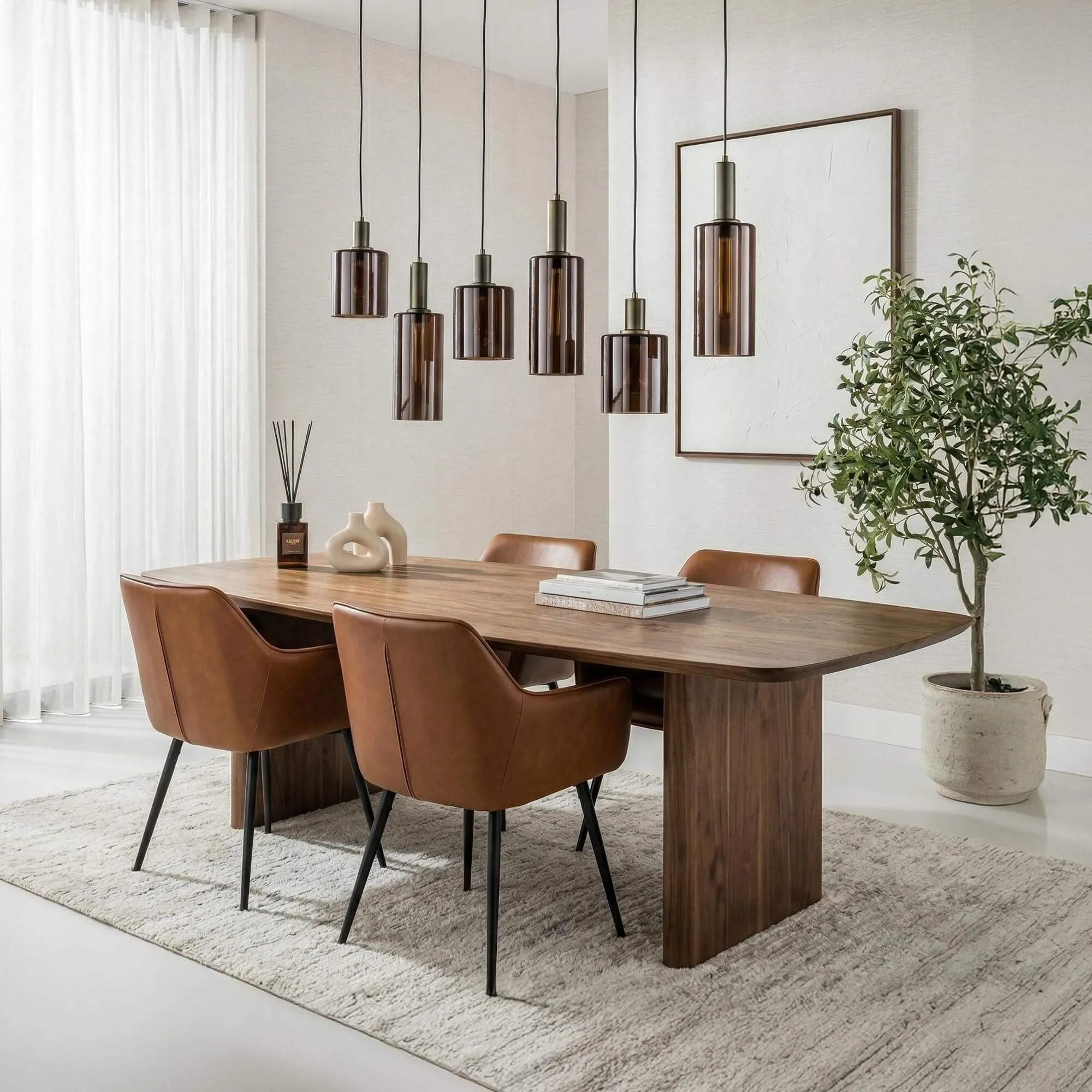 La structure en métal brun de ce luminaire en suspension en métal et verre fumé apporte une présence discrète et équilibrée, soulignant la finesse des lignes verticales. Avec une longueur d’environ 110 cm et une hauteur ajustable par abat-jour jusqu’à 150 cm, cette suspension s’intègre naturellement au-dessus d’une table de salle à manger, d’un îlot central ou d'une table de réunion dans un bureau, créant un point de lumière structurant sans surcharger l’espace. L’alignement des six suspensions permet une diffusion homogène de la lumière, idéale pour accompagner les moments de partage ou sublimer un espace de travail convivial.