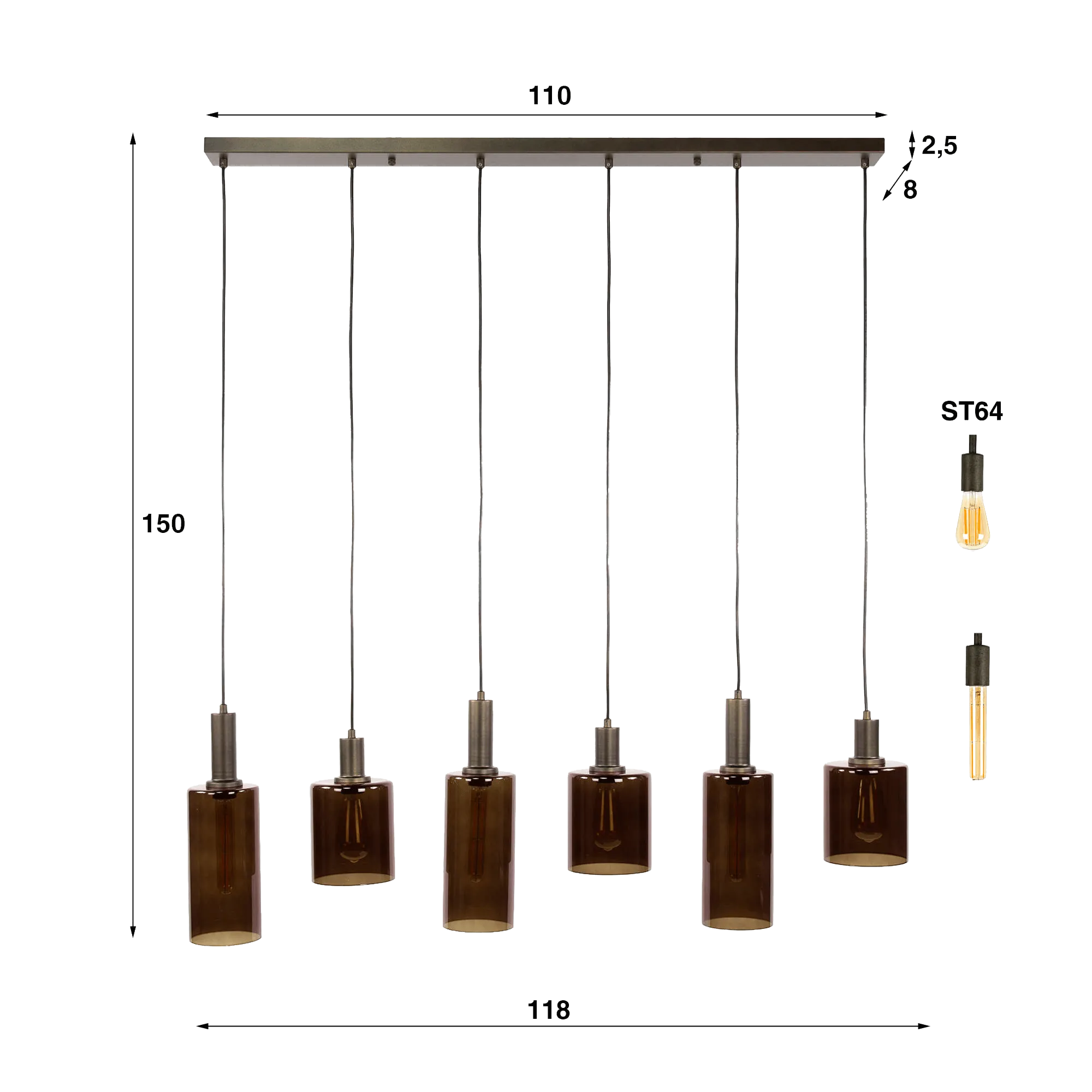 Nous avons particulièrement travaillé la qualité du verre fumé qui compose ce luminaire en suspension en métal brun afin d’obtenir une teinte profonde et nuancée, capable de moduler l’intensité lumineuse tout en laissant transparaître la chaleur des ampoules ST64 et T32-L185 (non incluses). Ce contraste entre la transparence subtile du verre et la texture mate du métal confère à l’ensemble une allure intemporelle, fidèle à l’esprit du modèle.